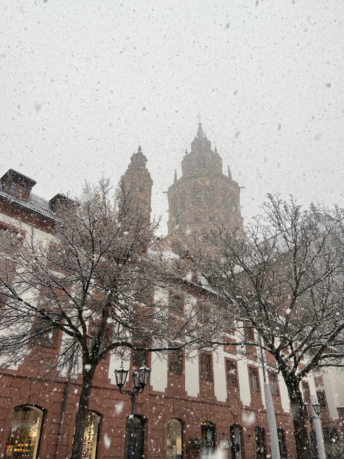 The image depicts a heavy snowfall in Mainz, Germany, centered on the Mainz Cathedral (Mainzer Dom). Large, distinct snowflakes are visibly falling across the entire scene against an overcast, bright…read more