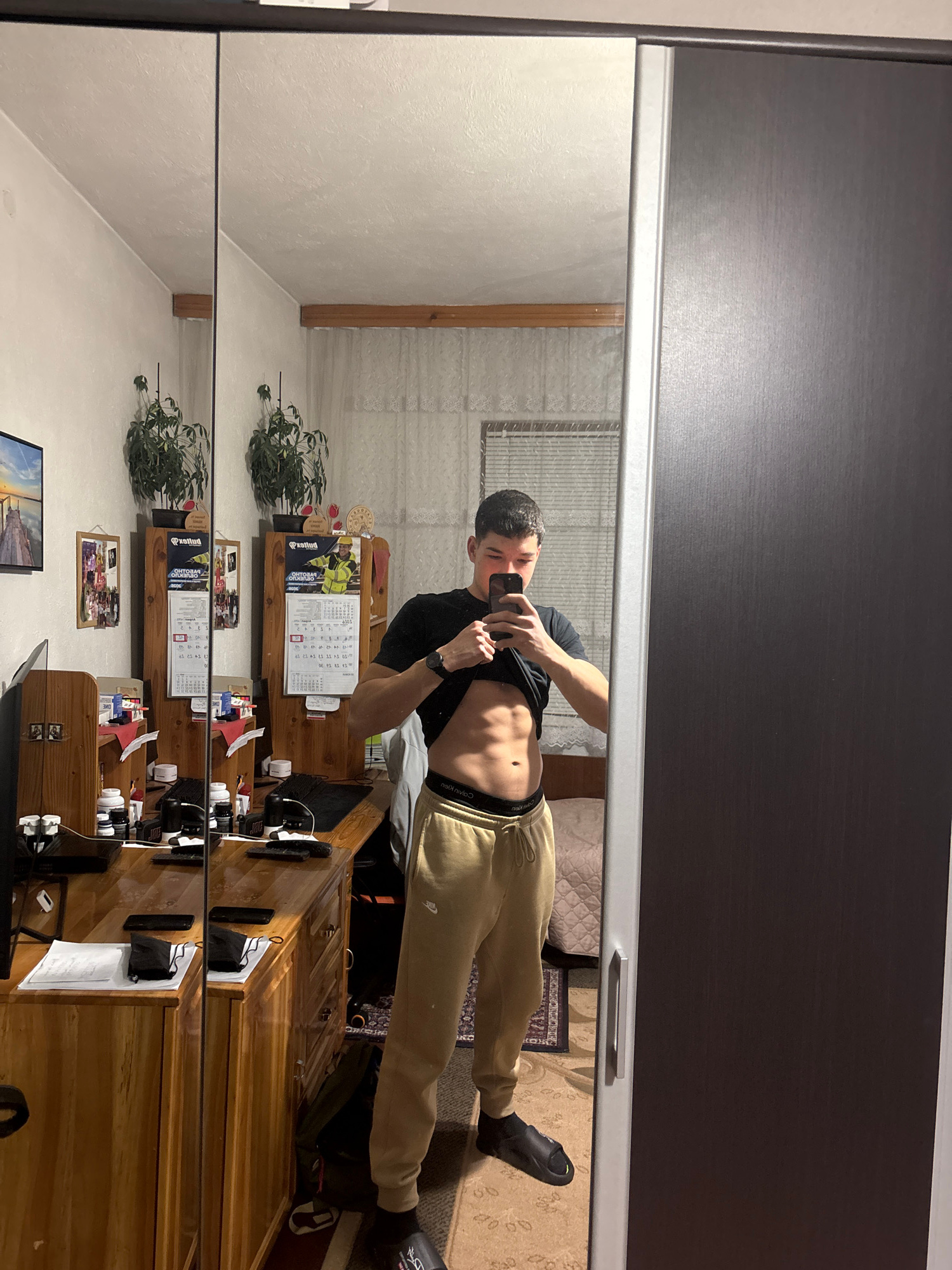 A man stands in front of a large, mirrored closet, holding his shirt up to expose his abdomen while taking a selfie. He is wearing a black t-shirt, light brown sweatpants with a Calvin Klein waistband…read more