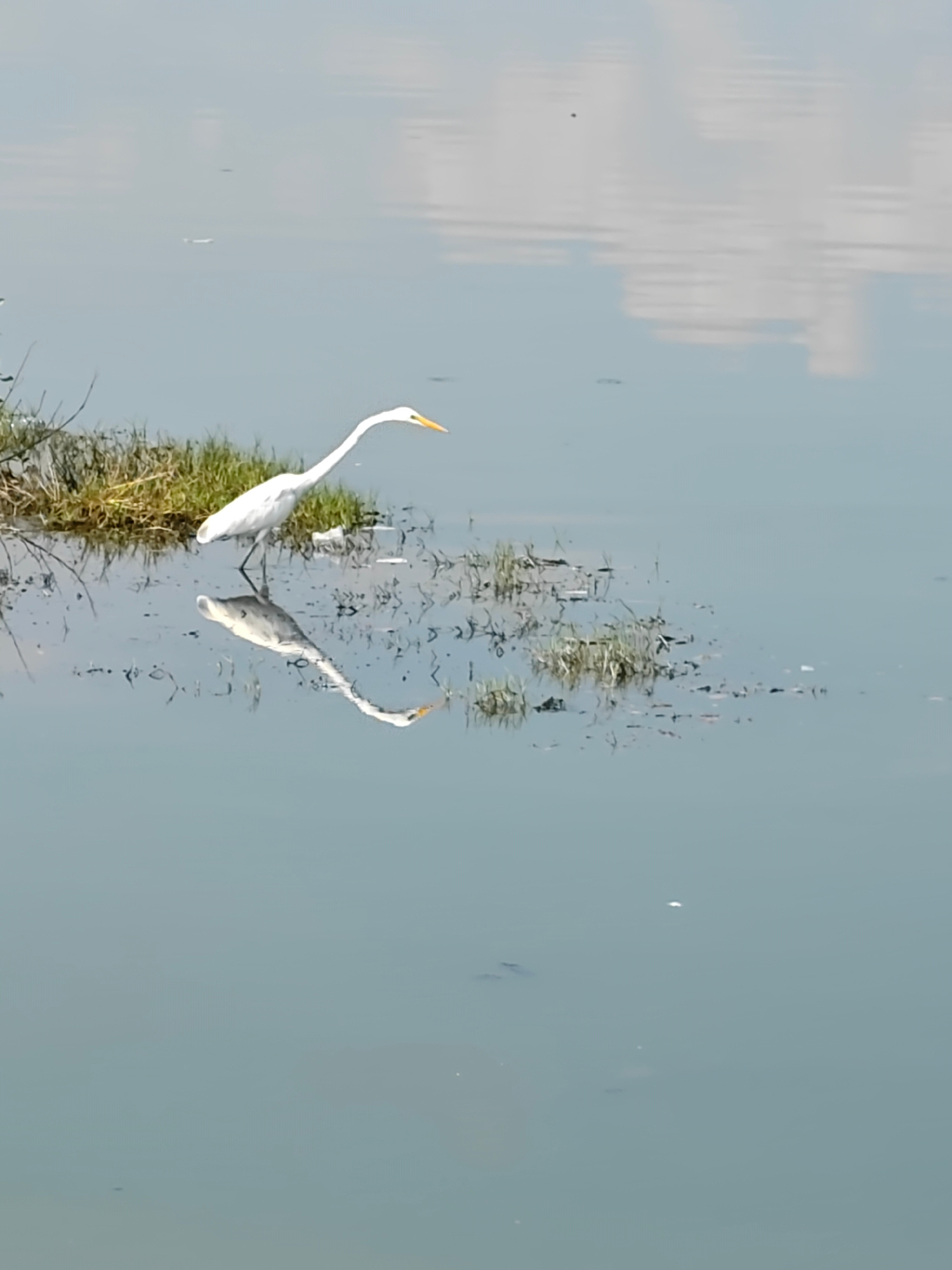 A white egret stands in shallow water with submerged vegetation, its reflection visible in the water's surface. The scene is set in a wetland environment. Lhokseumawe, Indonesia is not visually evidenβ¦read more