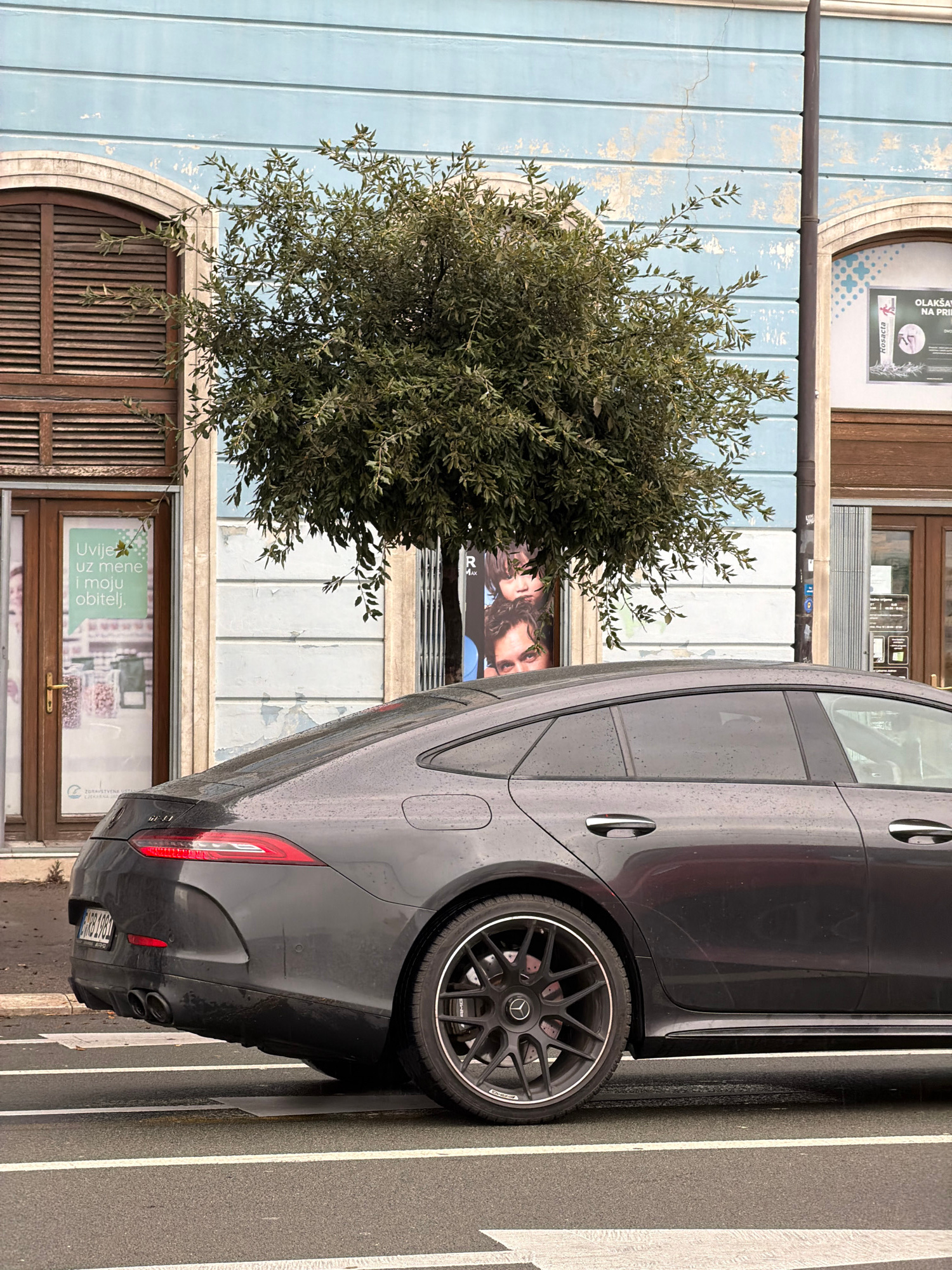 The image captures a scene in the city of Rijeka, Croatia, featuring a dark gray or black car parked adjacent to a pedestrian crossing. The car is positioned alongside a building with a light blue fac…read more