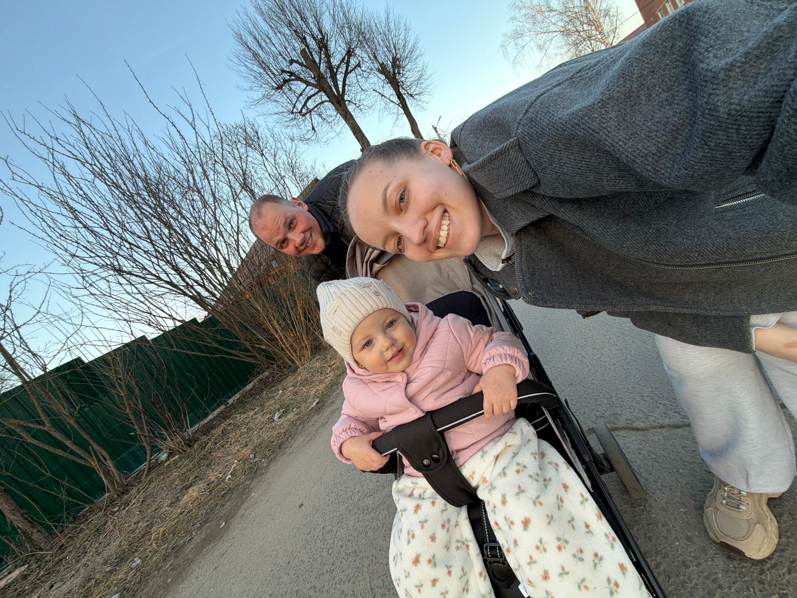 Three people are in the photograph, a man, a woman and an infant. The woman is smiling, wearing a grey jacket and light-colored pants and light-colored shoes. The man is smiling and wearing a dark-col…read more
