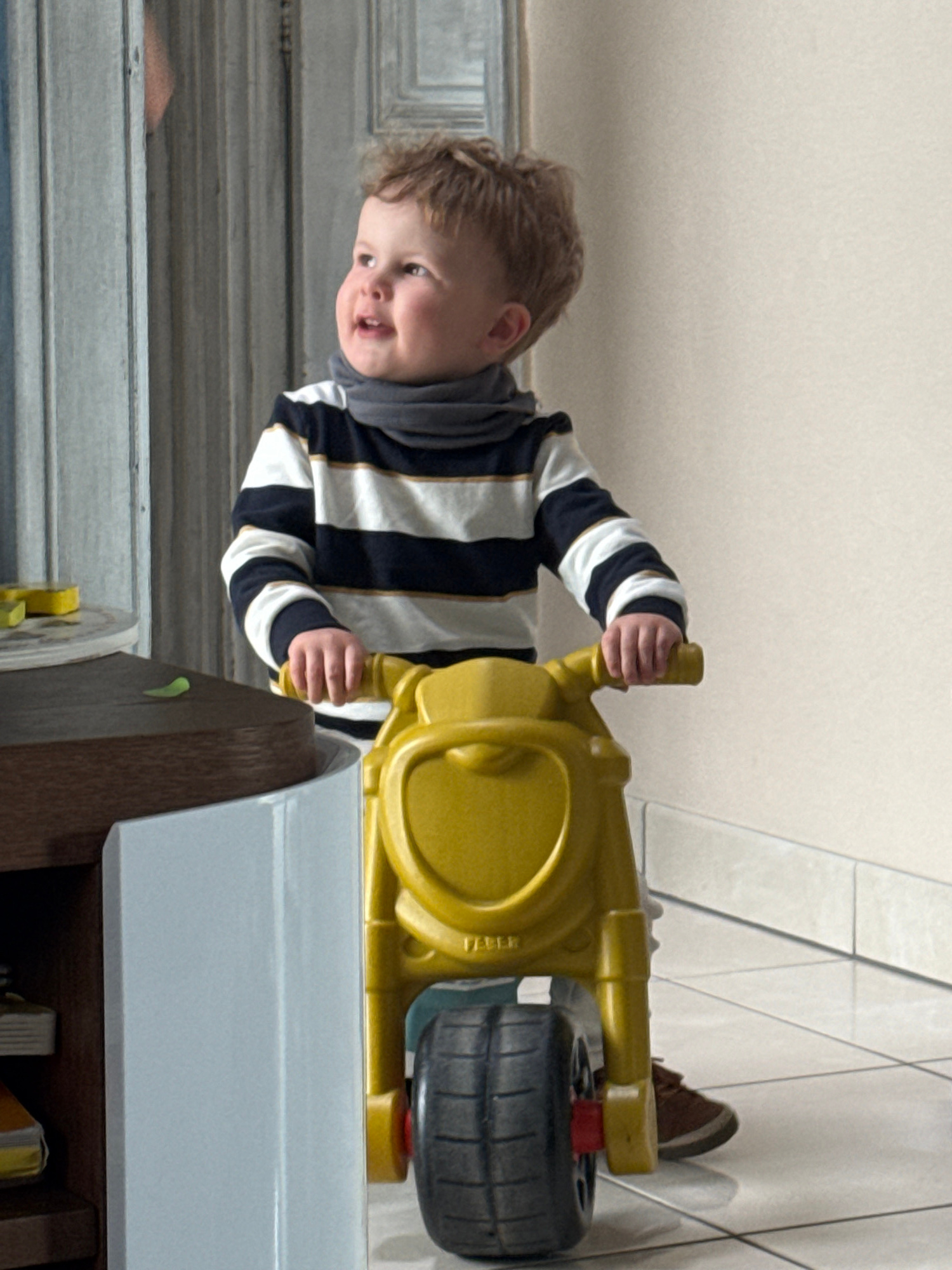 A young child with fair skin and light brown hair is shown in the image, wearing a striped shirt with a gray turtleneck. The stripes on the shirt are a combination of dark blue or black and white. The…read more