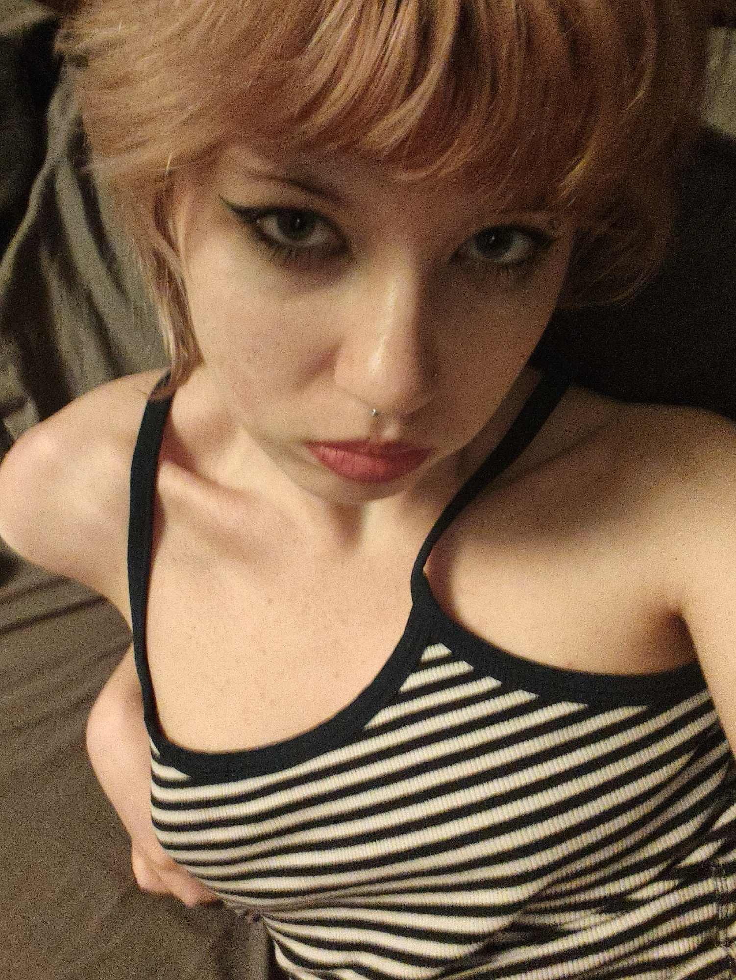 A young woman with fair skin and light reddish-blonde hair is lying down, facing the camera. She is wearing a black and white striped tank top with black trim. She has a nose piercing on the left side…read more