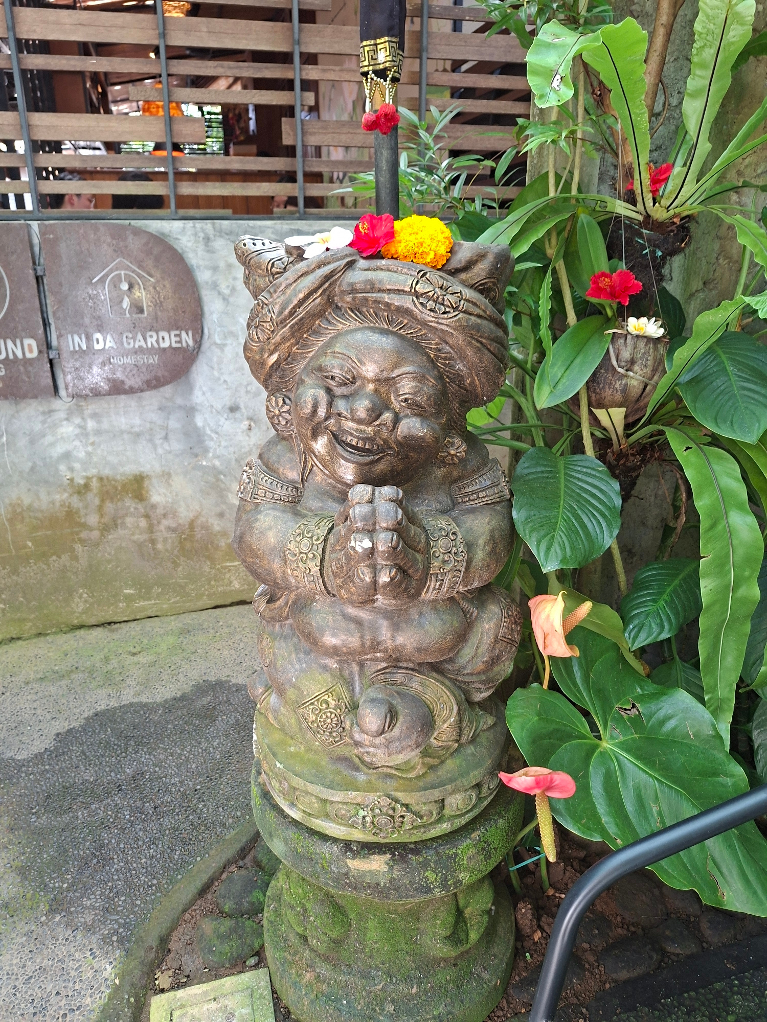 A stone statue of a smiling deity, adorned with flowers and surrounded by lush greenery, is situated outside. The statue is placed on a stone base, which has moss growing on it. The statue's head is d…read more