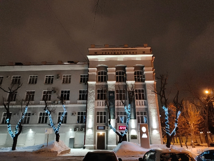 A low-angle shot captures a building illuminated at night. A large, multi-story structure dominates the view, with a lighter-colored facade and prominent architectural details. Windows punctuate the e…read more
