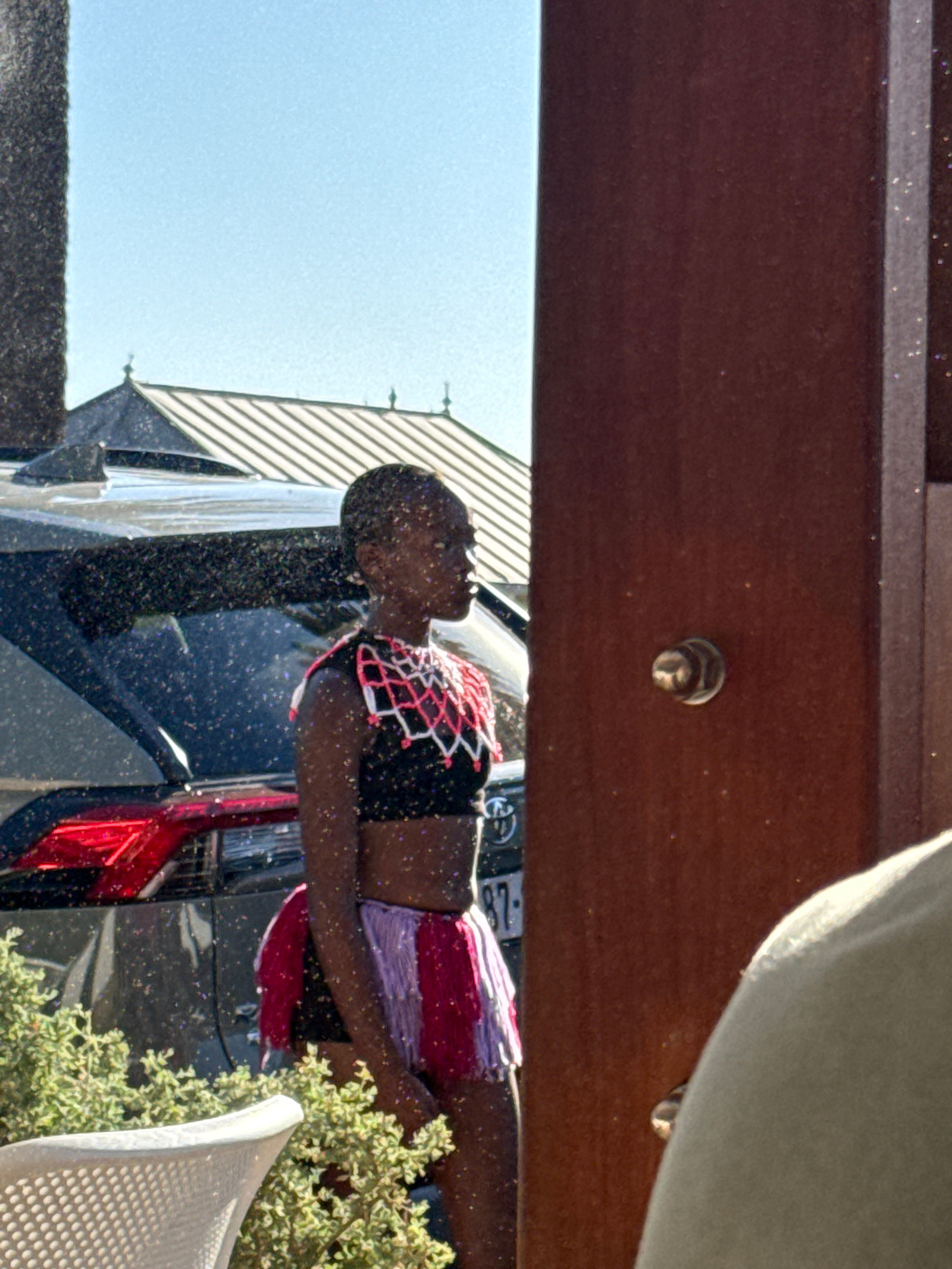 The image depicts an outdoor urban scene in Cape Town, South Africa, under clear blue skies with bright sunlight illuminating numerous sparkling airborne particles. A person with dark skin and a short…read more