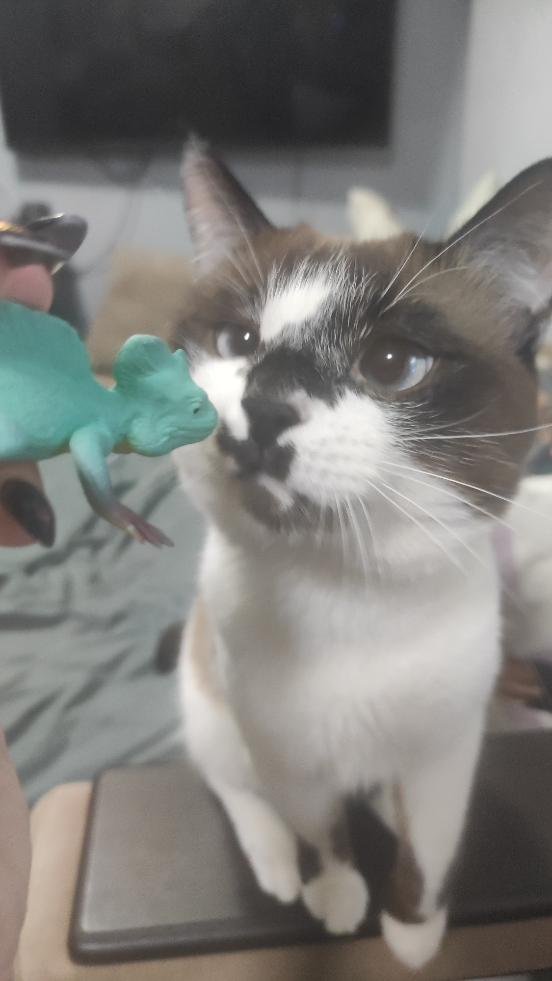 A close-up shot captures a brown and white cat looking down at a green plastic mouse toy. The toy is held by a person, visible only by their hand with dark nail polish. The background is blurred, reve…read more