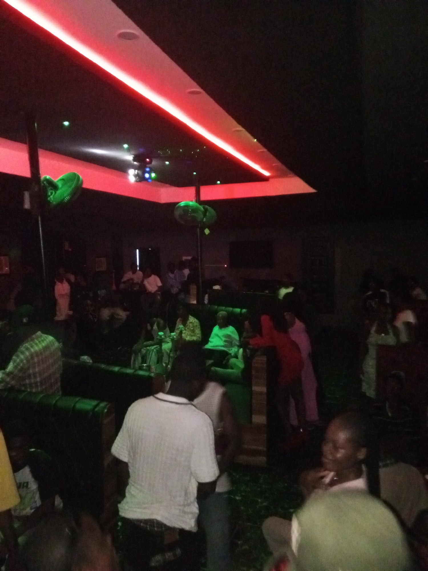 A dimly lit interior view shows a crowded space with multiple people, likely a club or lounge in Lokoja, Nigeria, given the context. The room has dark furnishings, including seating areas. The ceiling…read more