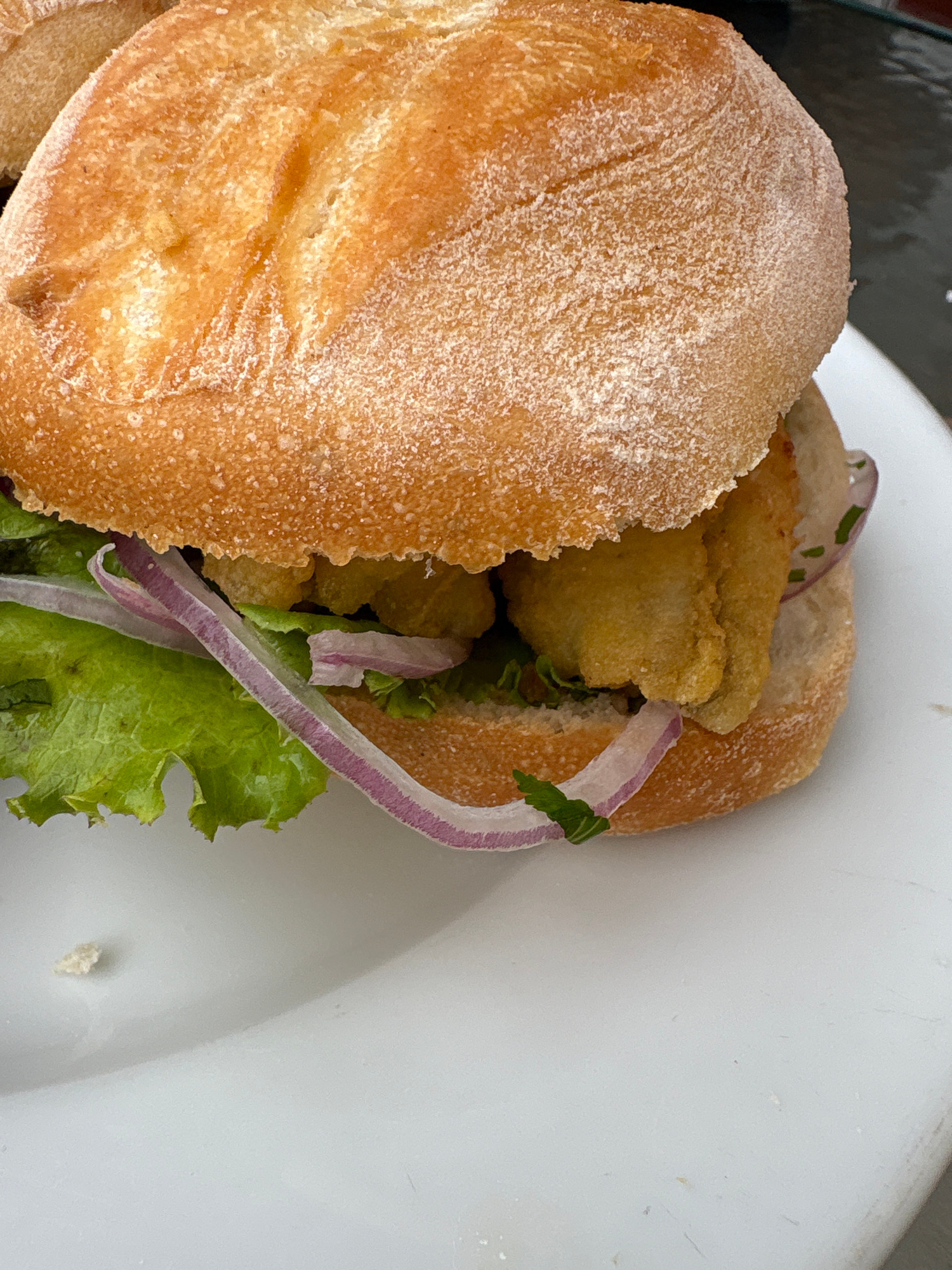 The image shows a close-up shot of a sandwich served on a white plate. The sandwich appears to have a bread roll with a crusty exterior. Inside the roll, there are fried pieces of food, possibly fish…read more