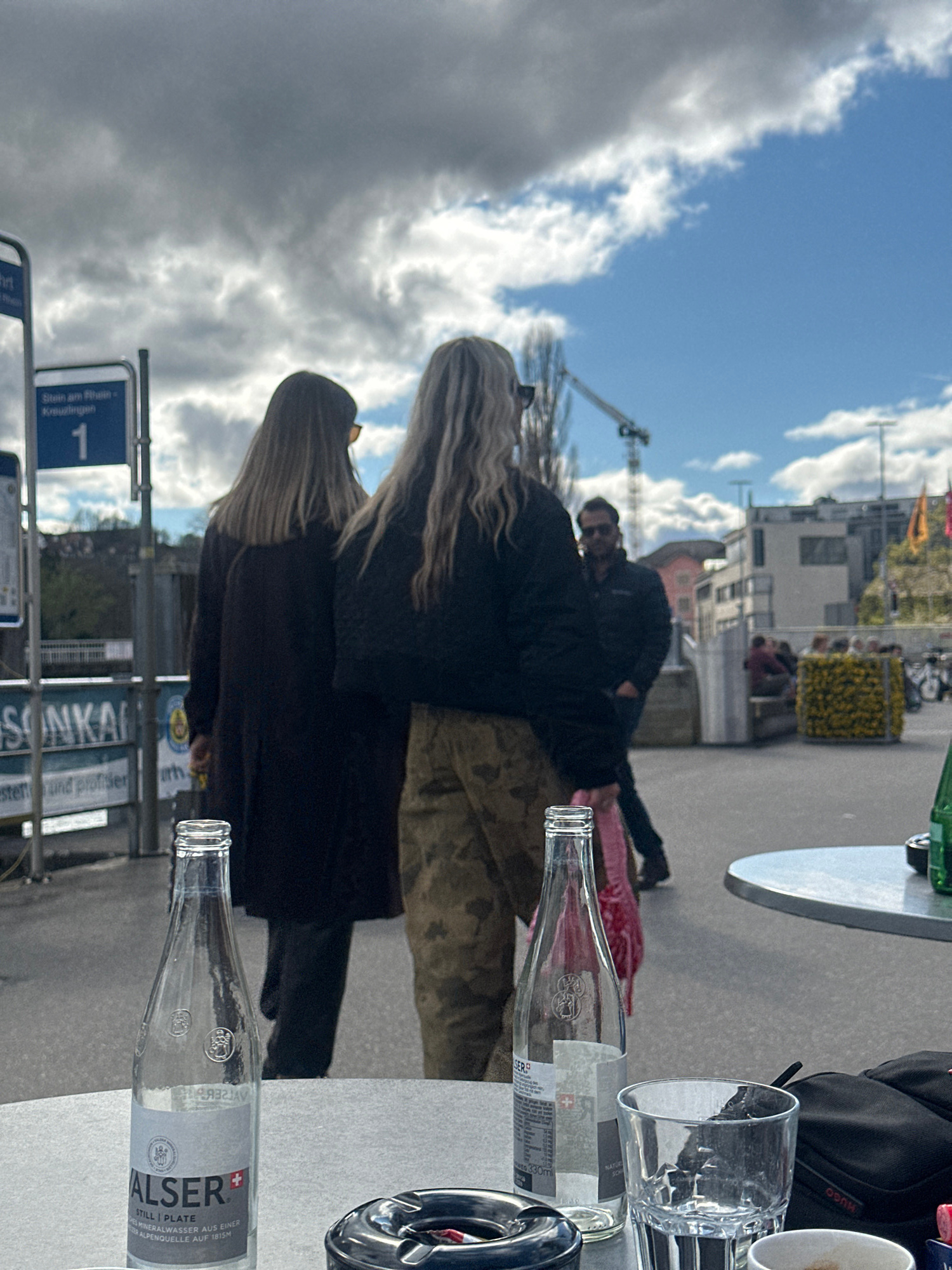 Here is a description of the image: The image shows a street scene in Schaffhausen, Switzerland. A group of people is visible, including two women with blonde hair, and other blurred people. There is…read more