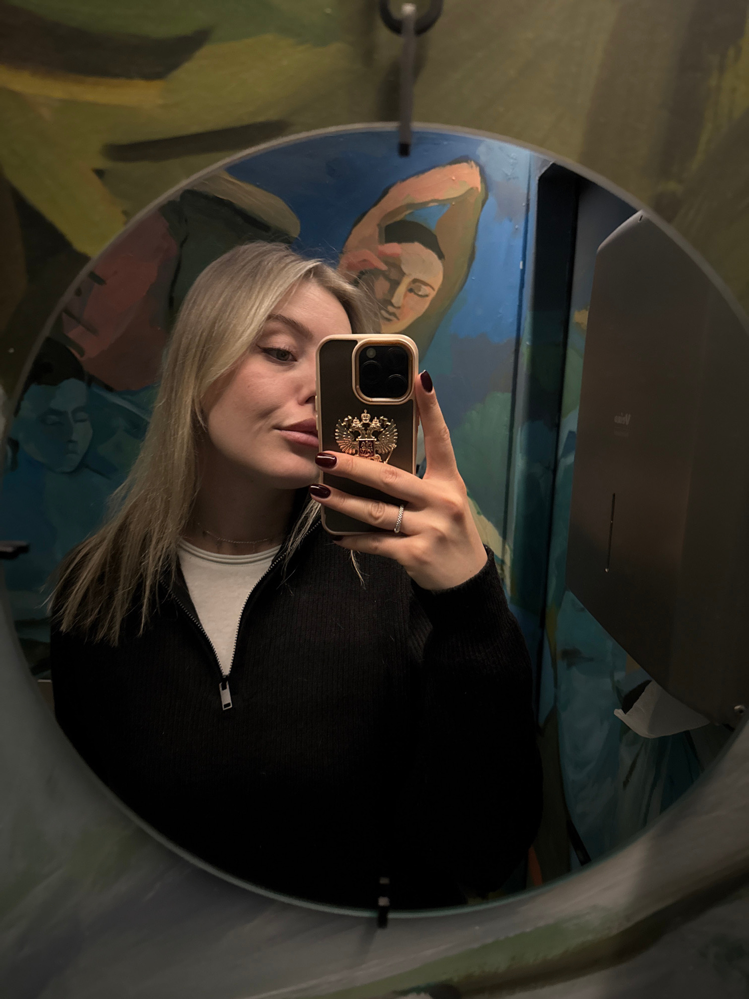 A young woman with blond hair takes a selfie in a round mirror. She wears a black zippered sweater over a white top. She holds a gold-rimmed iPhone. The mirror is in a bathroom, reflecting a colorful…read more