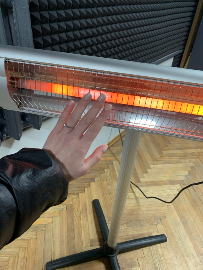 A forensic examination of the image reveals an indoor scene, located in the city of Kyiv, Ukraine. The primary subject is a radiant electric heater and a human left hand. The heater is a silver-tonedβ¦read more