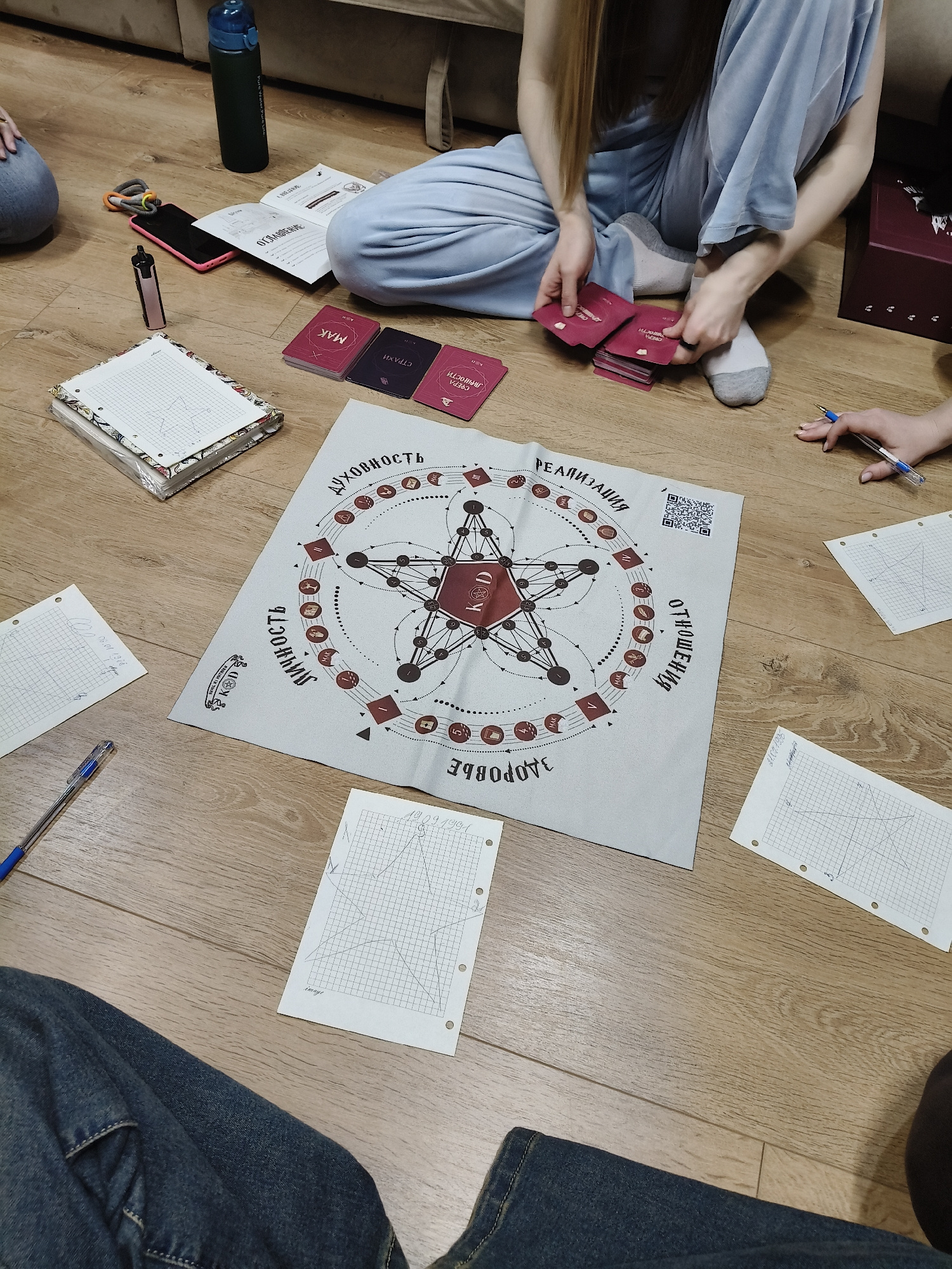 The scene depicts a group of people sitting on a wooden floor engaging in what appears to be a fortune-telling or divination activity. **People:** * Two individuals are prominently visible: one wear…read more