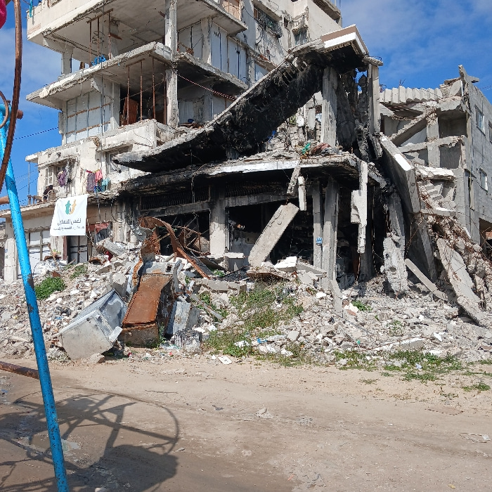 The image displays a severely damaged multi-story concrete building located in Gaza City, Palestinian Territory, under a bright blue sky with scattered white clouds. The structure exhibits extensive cā¦read more
