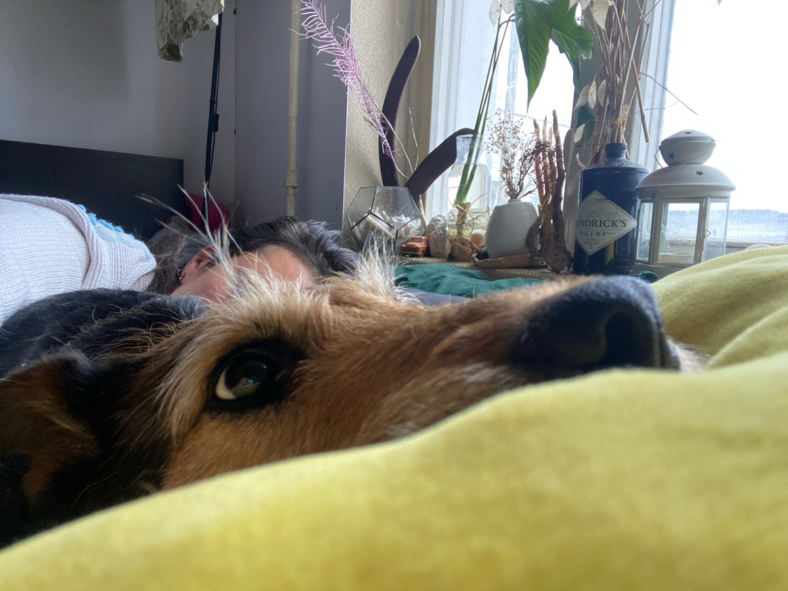 The image shows a close-up of a dog's face peering out from under a yellow cloth. The dog has brown and black fur and is looking directly at the camera. Behind the dog, a window sill is visible. On th…read more