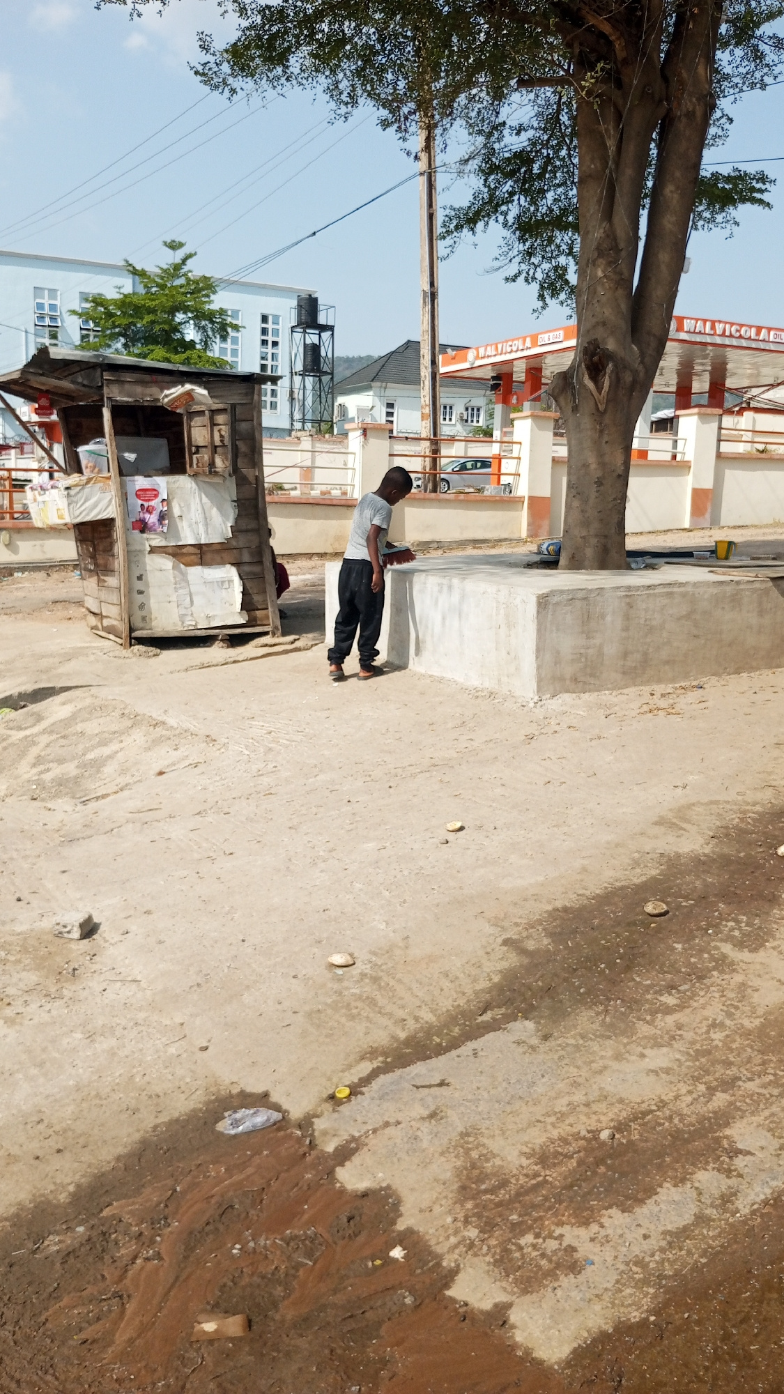 The image depicts a scene in Adankolo, Nigeria. A young person stands in front of a raised concrete structure that surrounds the base of a tree. They are wearing a light-colored t-shirt and dark pants…read more