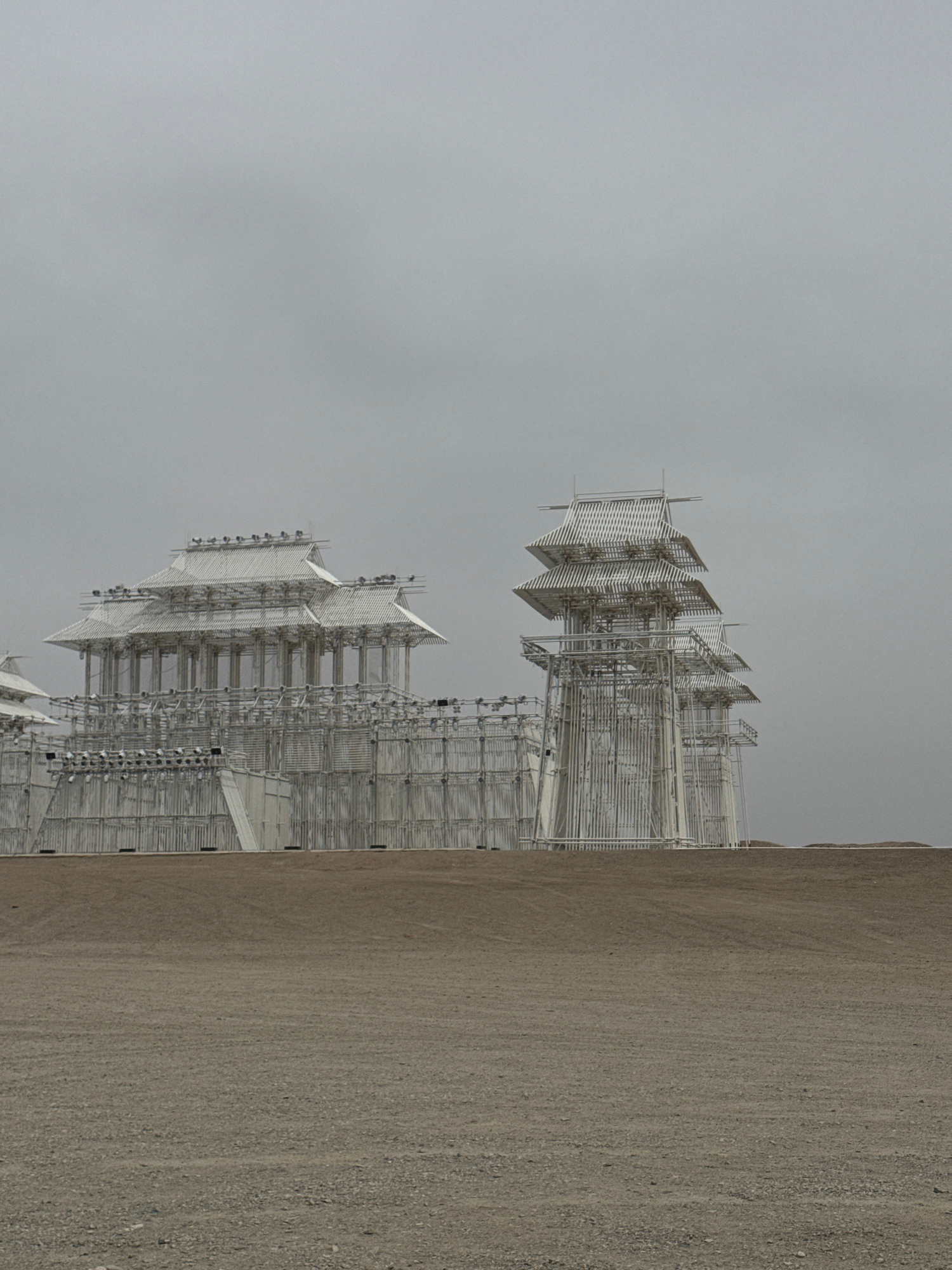 The image shows a large, modern architectural structure composed of multiple tiered and interconnected sections. The structure appears to be constructed of metal and possibly wood, with a dense networ…read more