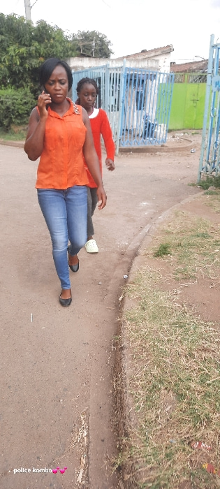 Two women are walking on a paved path next to a grassy area. The woman in the foreground is wearing an orange top and blue jeans and looking down while touching her face. Behind her, another woman is…read more