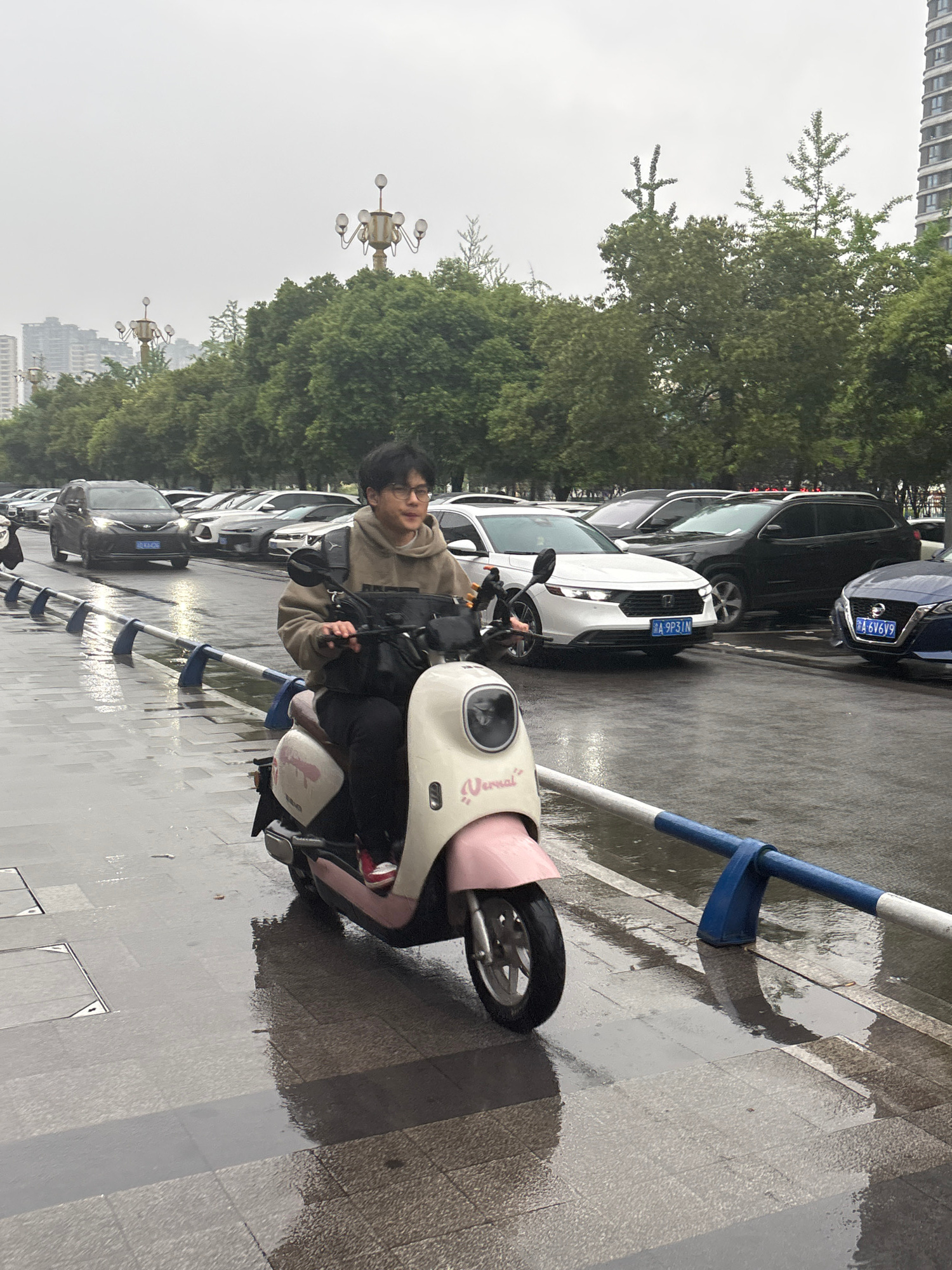 A young man with dark hair and glasses, wearing a tan hoodie, is riding a small, light-colored electric scooter on a wet city street in Jiangjin, China. He is positioned to the right of a blue and whi…read more