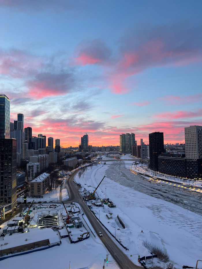 A vibrant cityscape at dusk features a pink and orange sky reflected in scattered clouds. Below, a river runs alongside modern buildings, some under construction. A road, blanketed with snow, winds al…read more