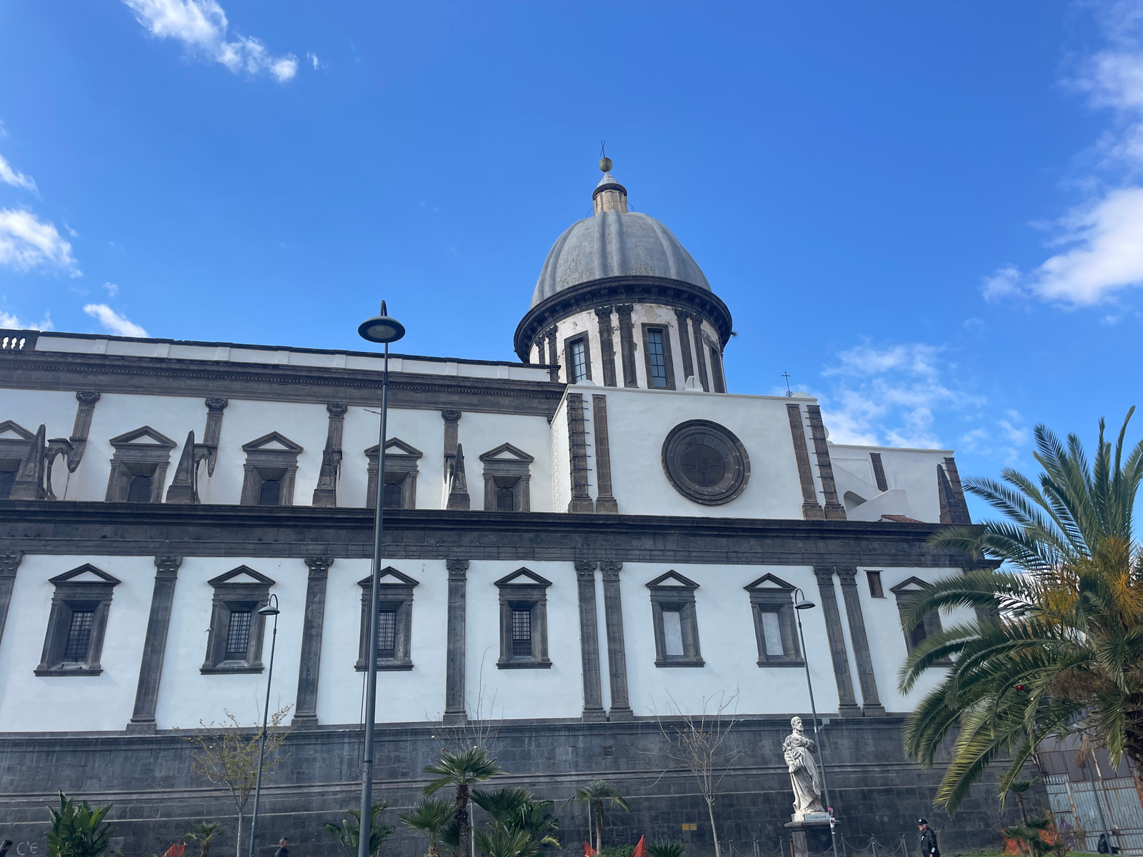 The image displays the exterior of the Basilica di San Paolo Maggiore in Naples, Italy, under a bright blue sky with scattered white cumulus clouds. The building's facade is predominantly white with a…read more