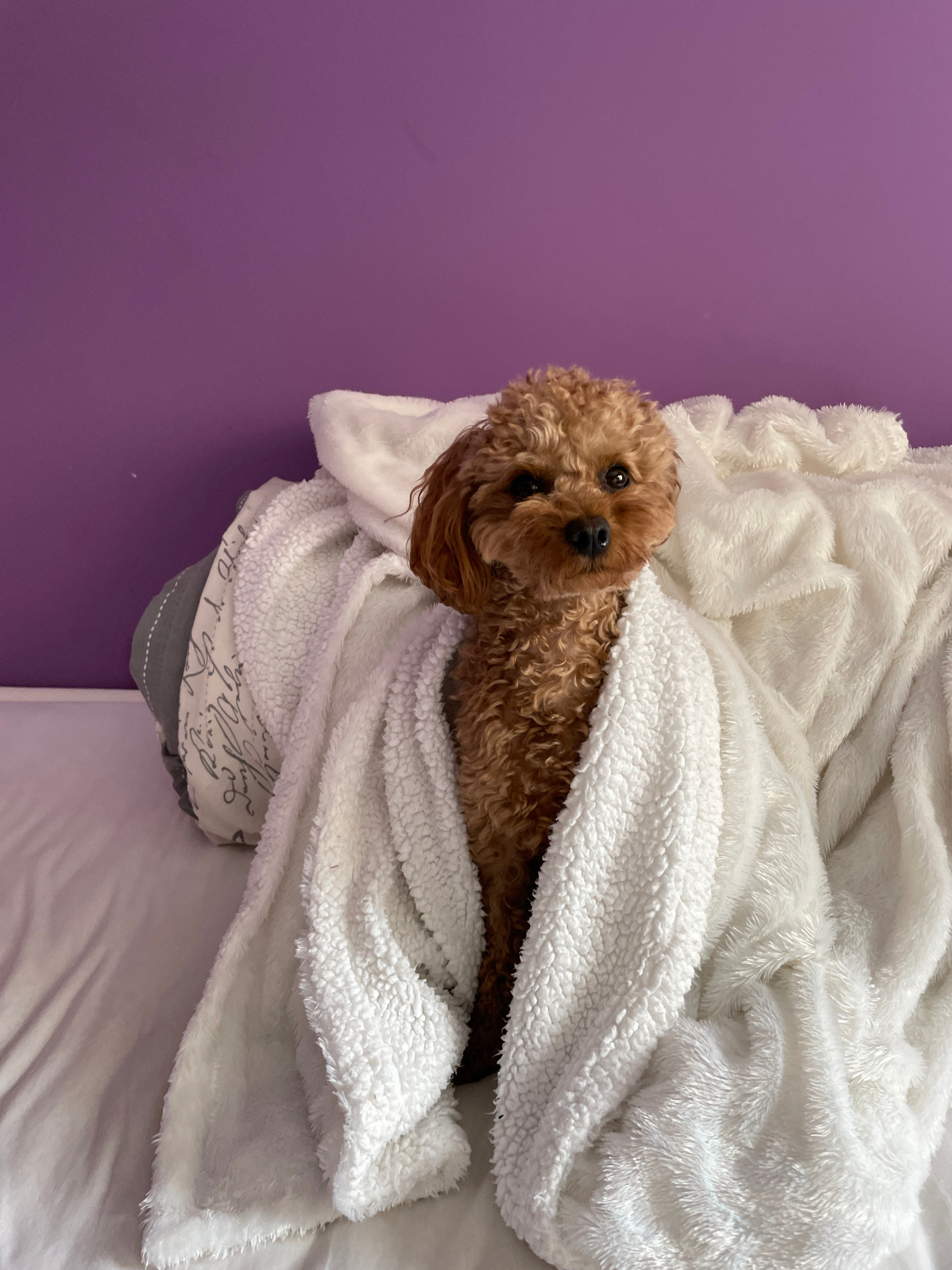 A brown poodle dog is lying in bed, partially covered with a white, fluffy blanket. The dog is looking at the camera. To the left of the dog and blanket is a purple wall. The edge of a bed with a whit…read more