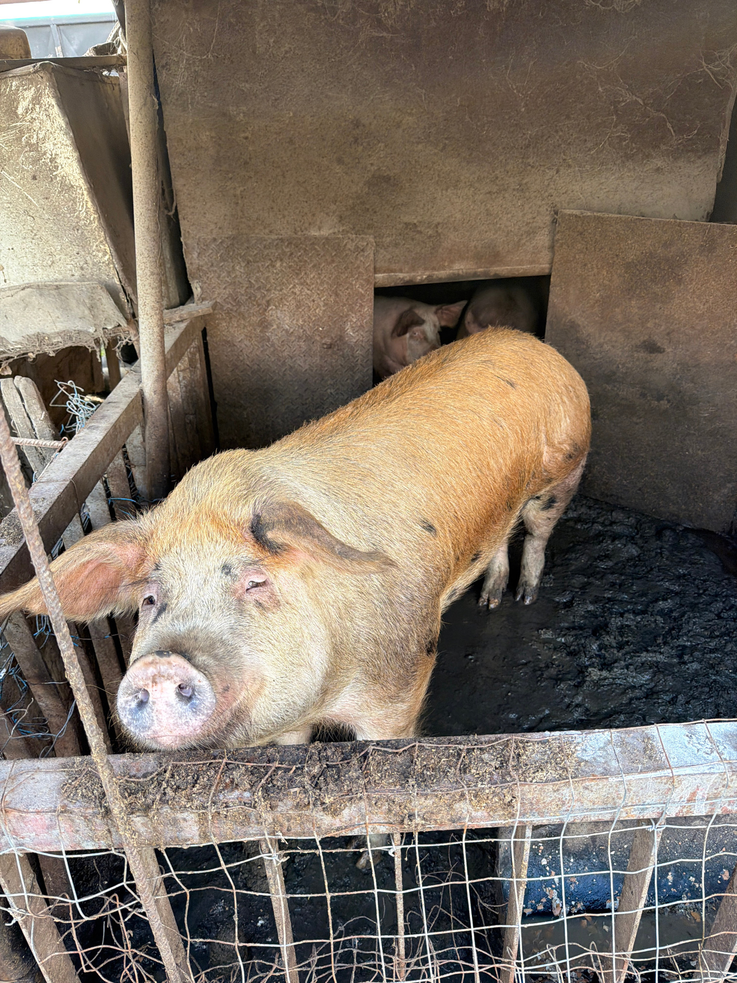 In Neofit Rilski, Bulgaria, a tan and spotted pig stands in a dirty enclosure. The pig is positioned near a rusty wire fence, with a dark, muddy area behind it. Two smaller pigs are visible in a shelt…read more