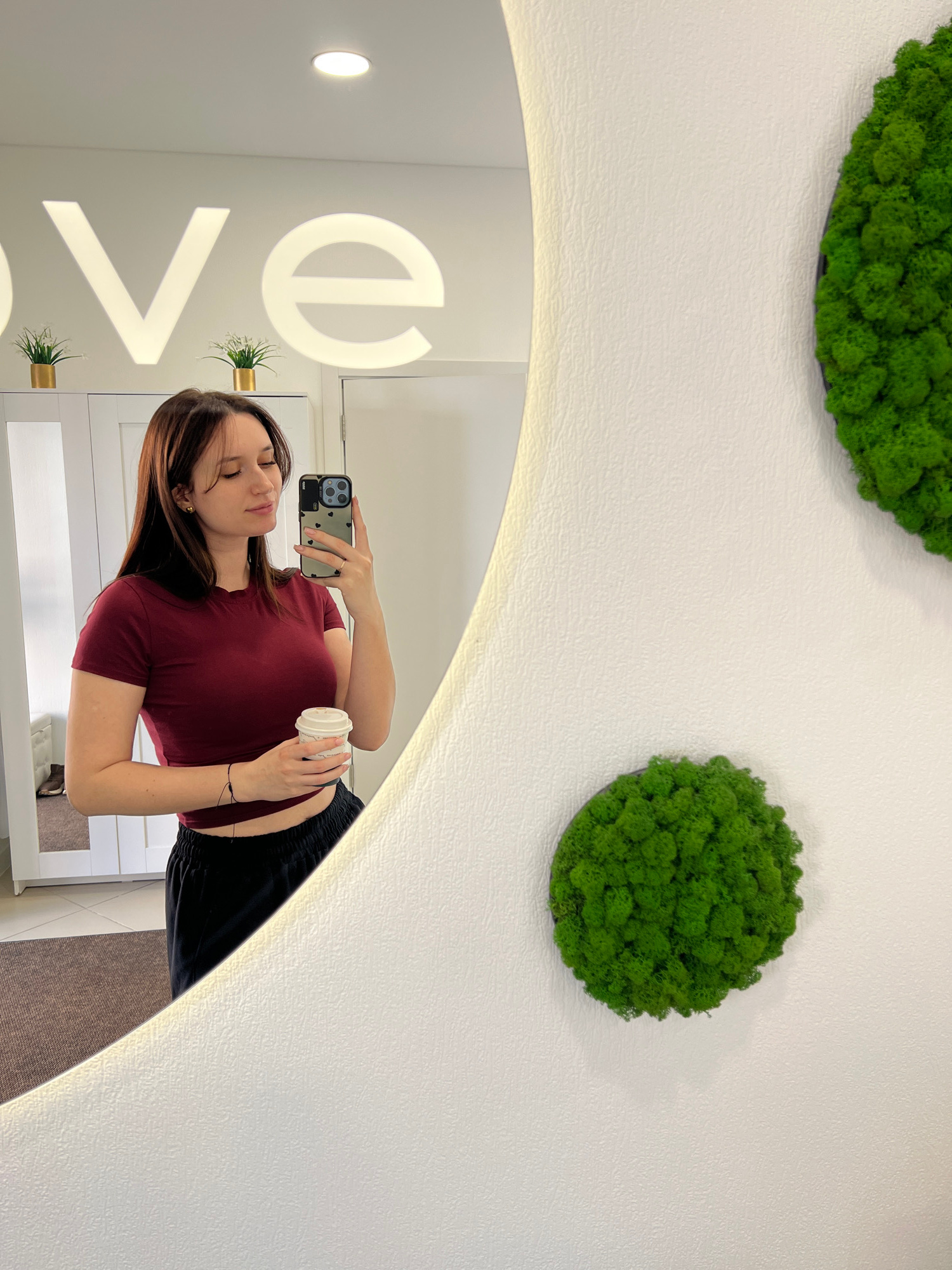 A woman in Tyumen, Russia takes a selfie in a mirror. She wears a maroon t-shirt and black pants, and holds a white cup. The wall features two round green moss decorations and part of the word "LOVE"…read more