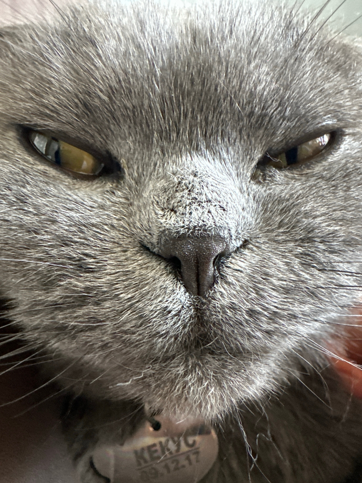 A close-up, high-angle shot captures the face of a gray cat, likely a Russian Blue or similar breed, lying on its side. The cat's dense, short-haired fur appears in shades of grey with hints of lighte…read more