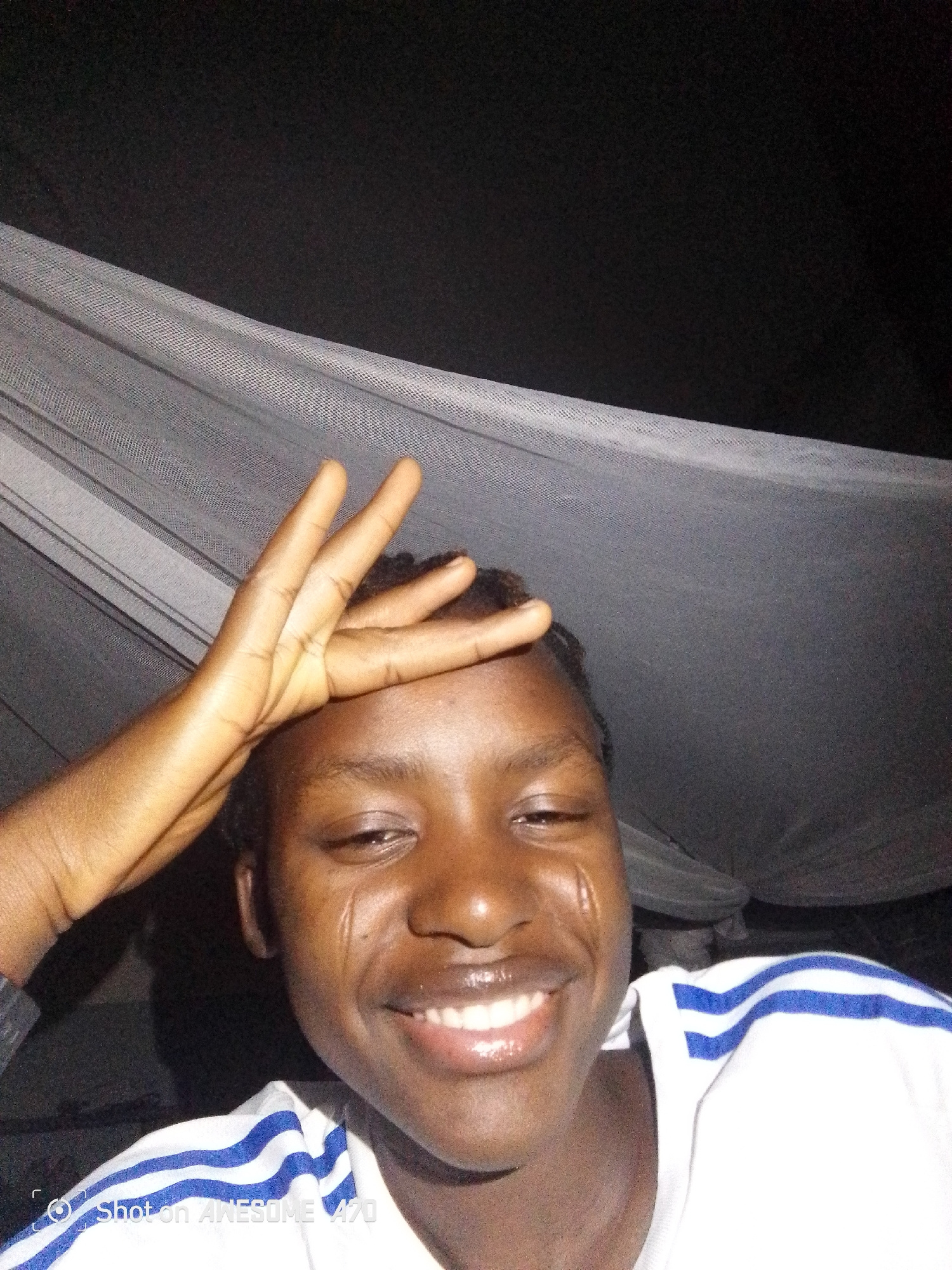 A close-up shot shows a person smiling with their hand on their forehead. They are wearing a white shirt with blue stripes on the shoulder. A mosquito net is visible in the background. The location is…read more