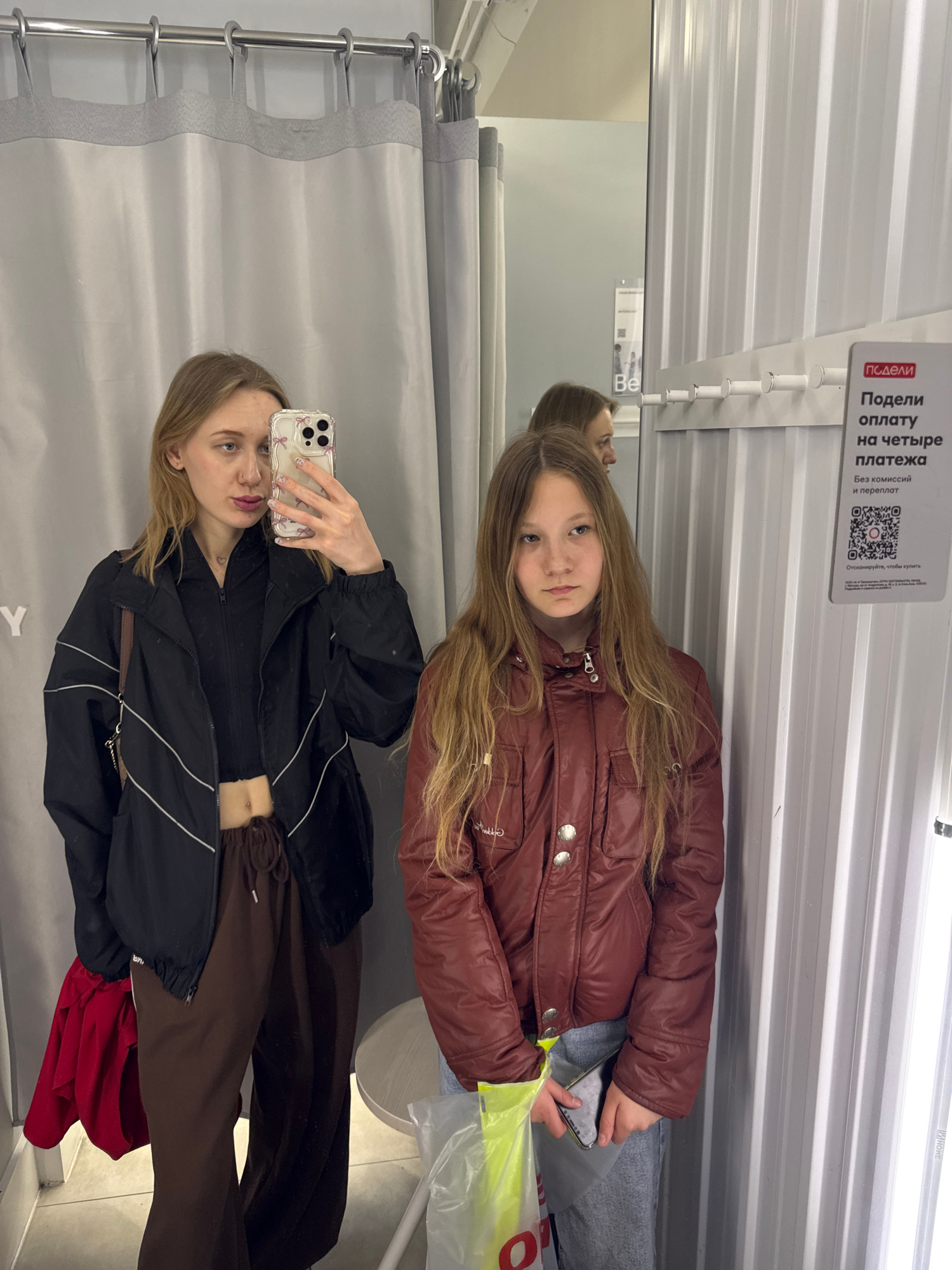 The image captures a young woman taking a selfie in a fitting room. The reflection in the mirror shows a second person, possibly a younger girl, posing with a burgundy jacket. The fitting room has gra…read more