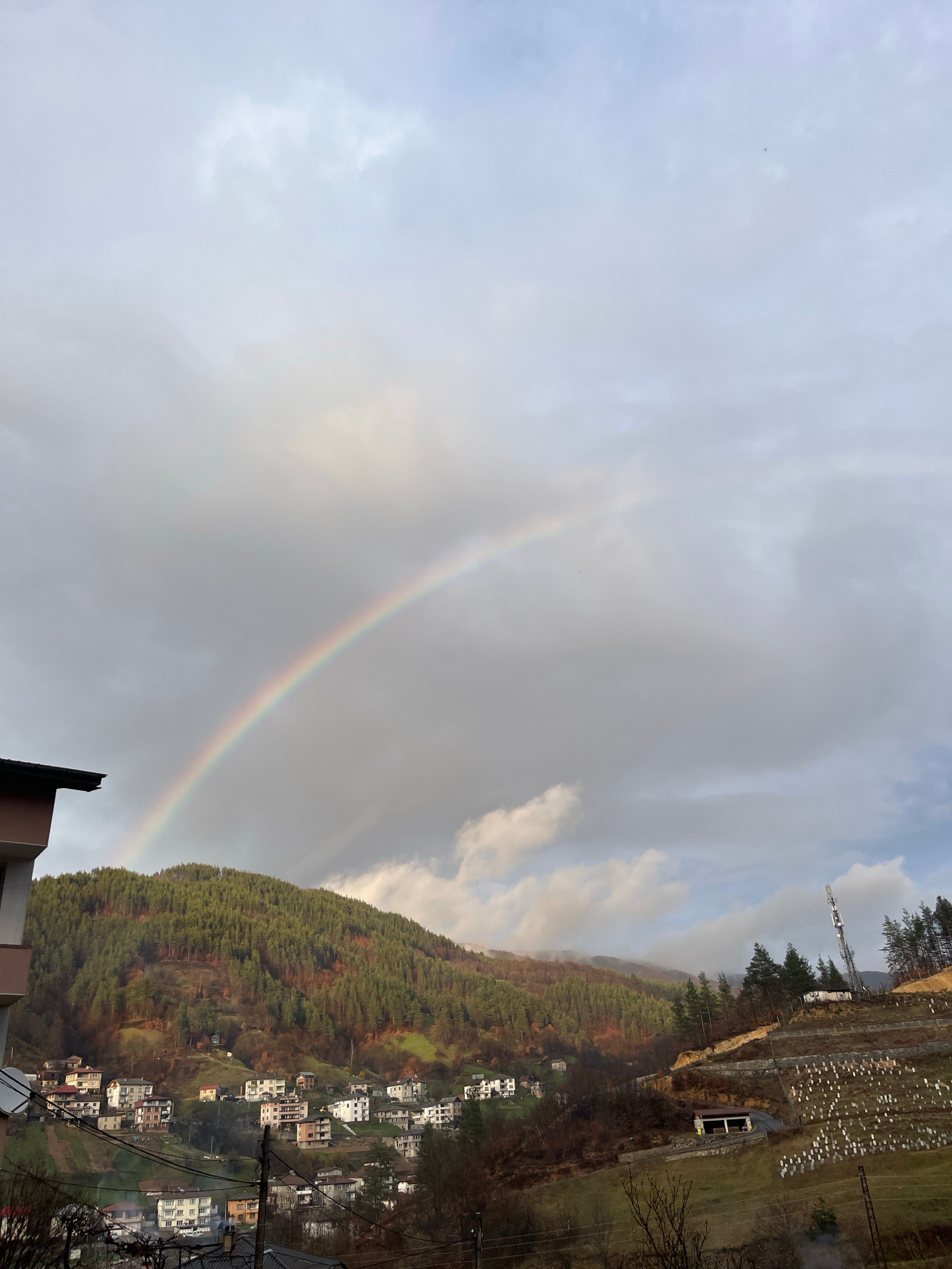 The image presents a landscape with a rainbow in the sky. The rainbow arcs from the cloudy sky towards a forested hillside with residential buildings nestled into it. The hillside has a mix of green t…read more