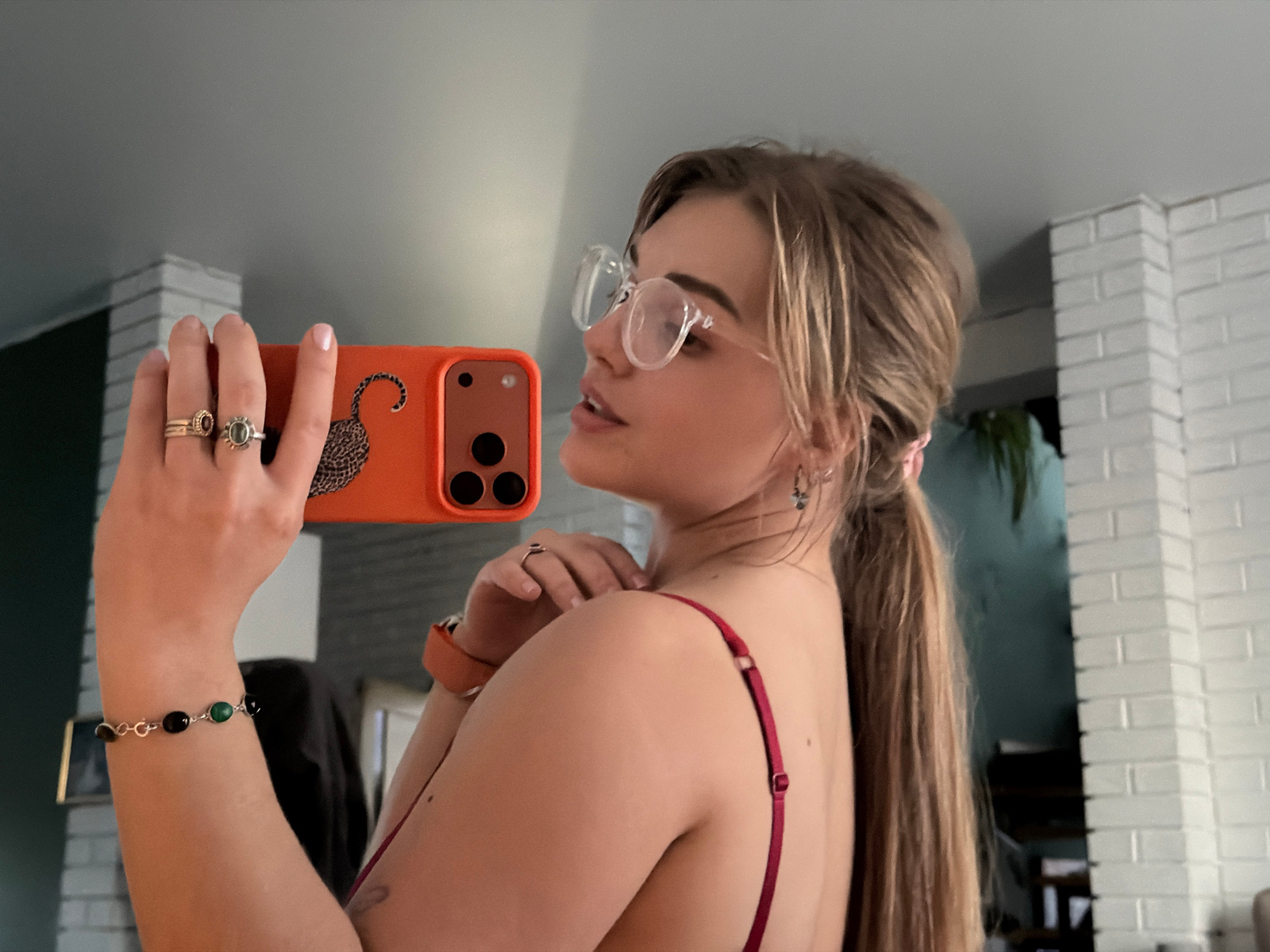 The image depicts a woman holding an orange cellphone case with a leopard design. She is wearing glasses and multiple rings on her fingers, as well as a beaded bracelet on her wrist. She has blonde ha…read more