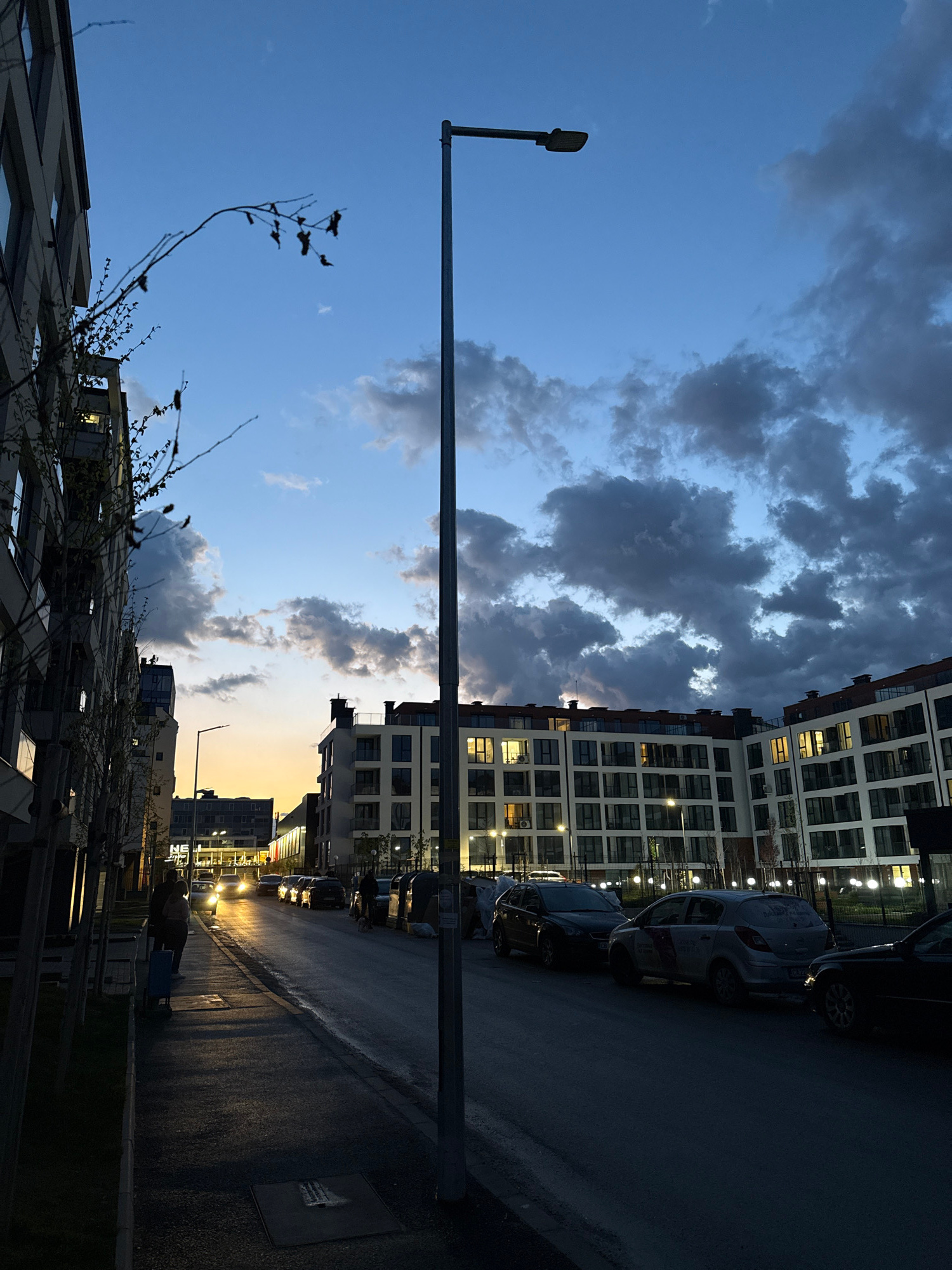 The image shows an urban street scene at dusk. The sky is a gradient of blue to orange, with dark clouds overhead. A tall street lamp extends horizontally across the frame. A modern, multi-story build…read more