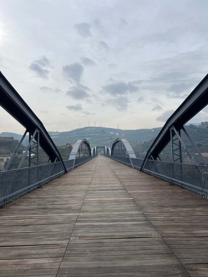 The image depicts an unoccupied railway bridge, now a pedestrian walkway, over the Douro River in Peso da Régua, Portugal. The perspective is centered on the bridge, looking along its length. The brid…read more