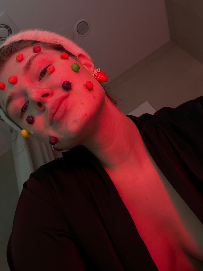 A female individual is depicted from a low-angle perspective, illuminated by strong red lighting. Her face is adorned with multiple small, multi-colored, spherical objects resembling candies, affixed…read more