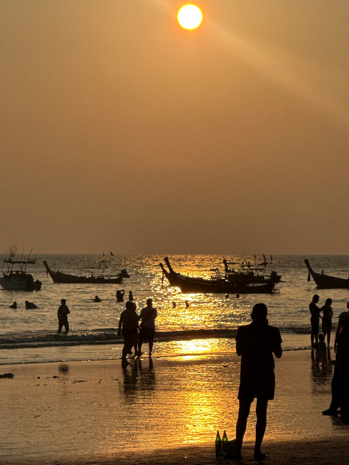 The image captures a sunset scene at Karon Beach, Thailand. The upper portion of the frame is dominated by a hazy, golden-orange sky, with a bright, circular, white-yellow sun positioned in the upper…read more