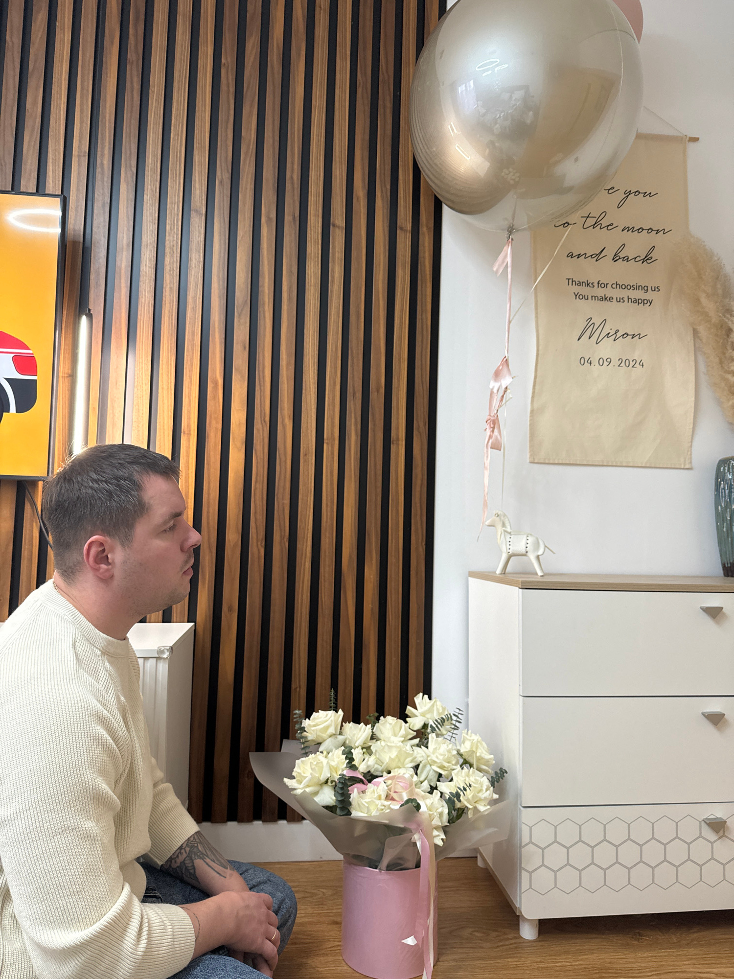 This image captures an indoor scene, likely a celebratory moment, within a home in Akulovo (Gp Kubinka), Russia. A man, seen from the chest up, is positioned on the right side, wearing a light-colored…read more