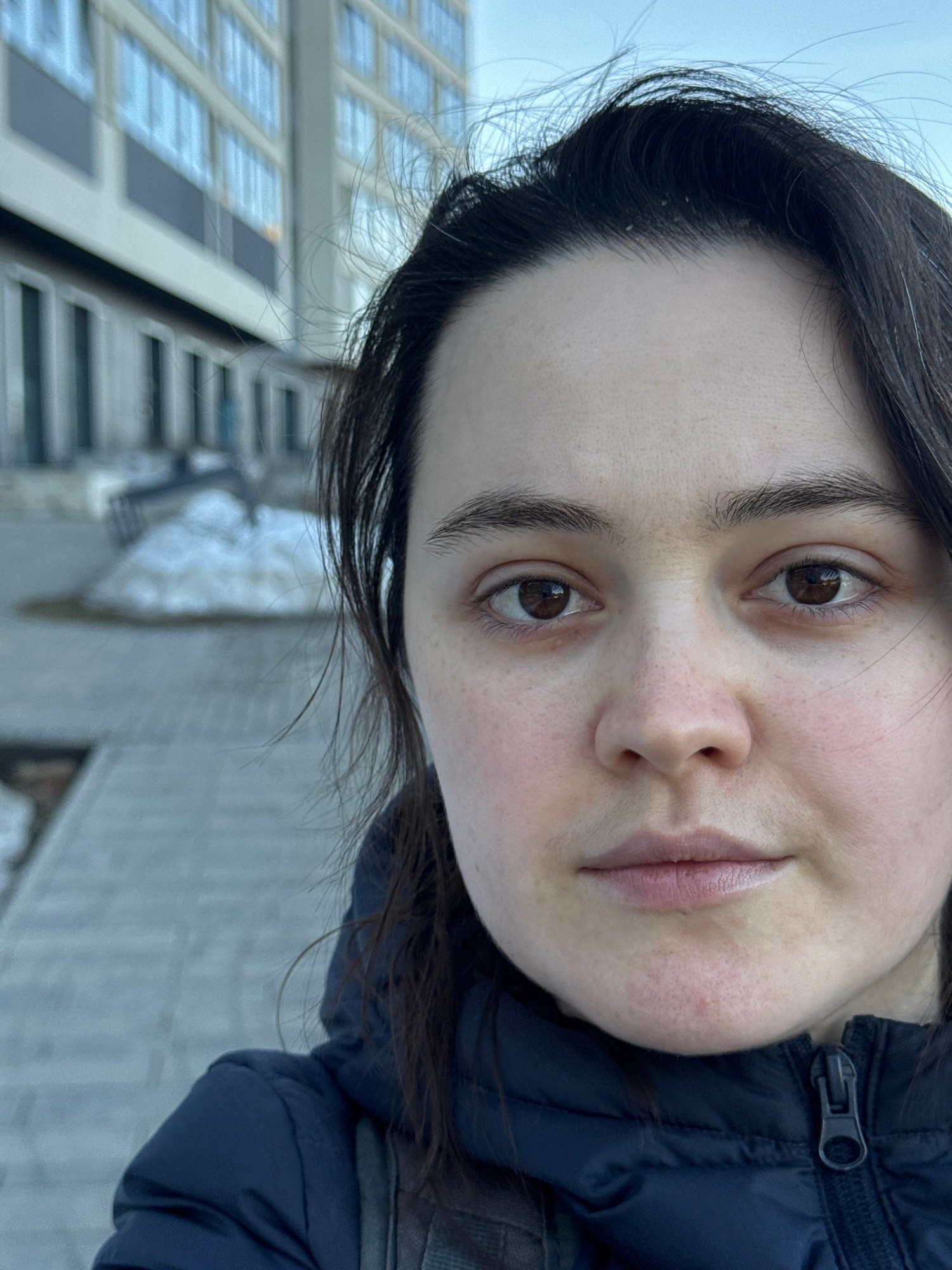 A selfie of a woman with dark hair and brown eyes. She is wearing a dark blue winter jacket. Snowflakes are visible in her hair. In the background, an apartment building is visible. Although the locat…read more