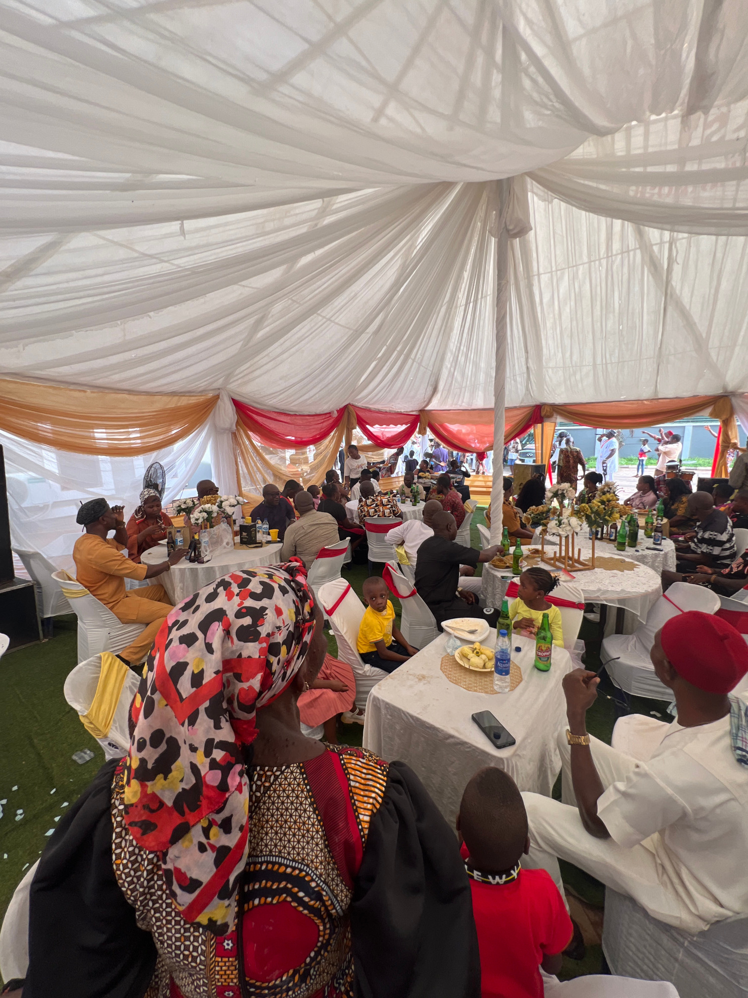 The image depicts an event occurring under a large tent in Onitsha, Nigeria. Numerous people are seated at tables covered with white cloths, laden with food and drinks. Individuals are dressed in a va…read more