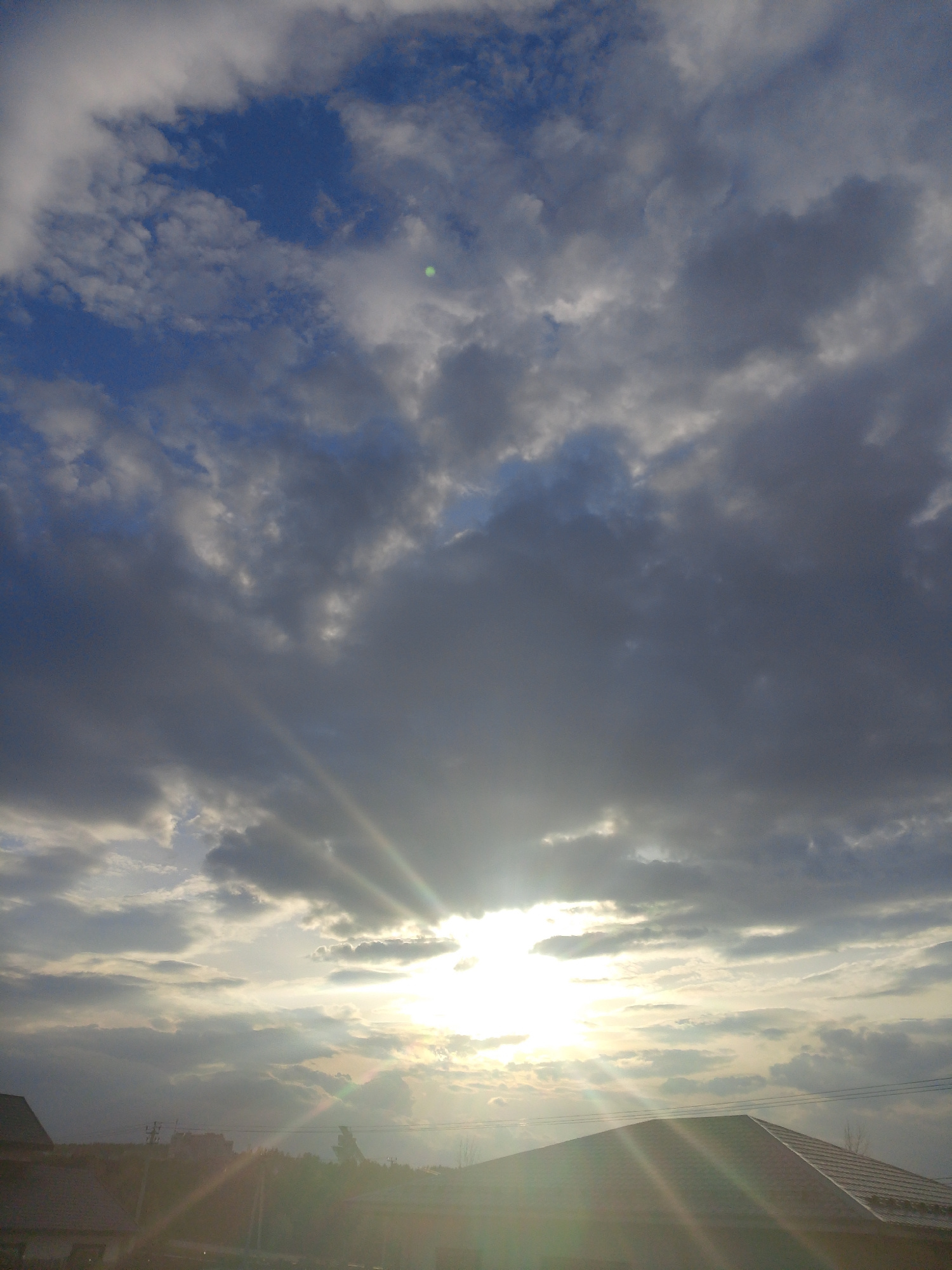 The image shows a cloudy sky with sunlight breaking through. The sky transitions from patches of blue to dense gray clouds. Beams of sunlight radiate downwards, illuminating the horizon. Below the hor…read more