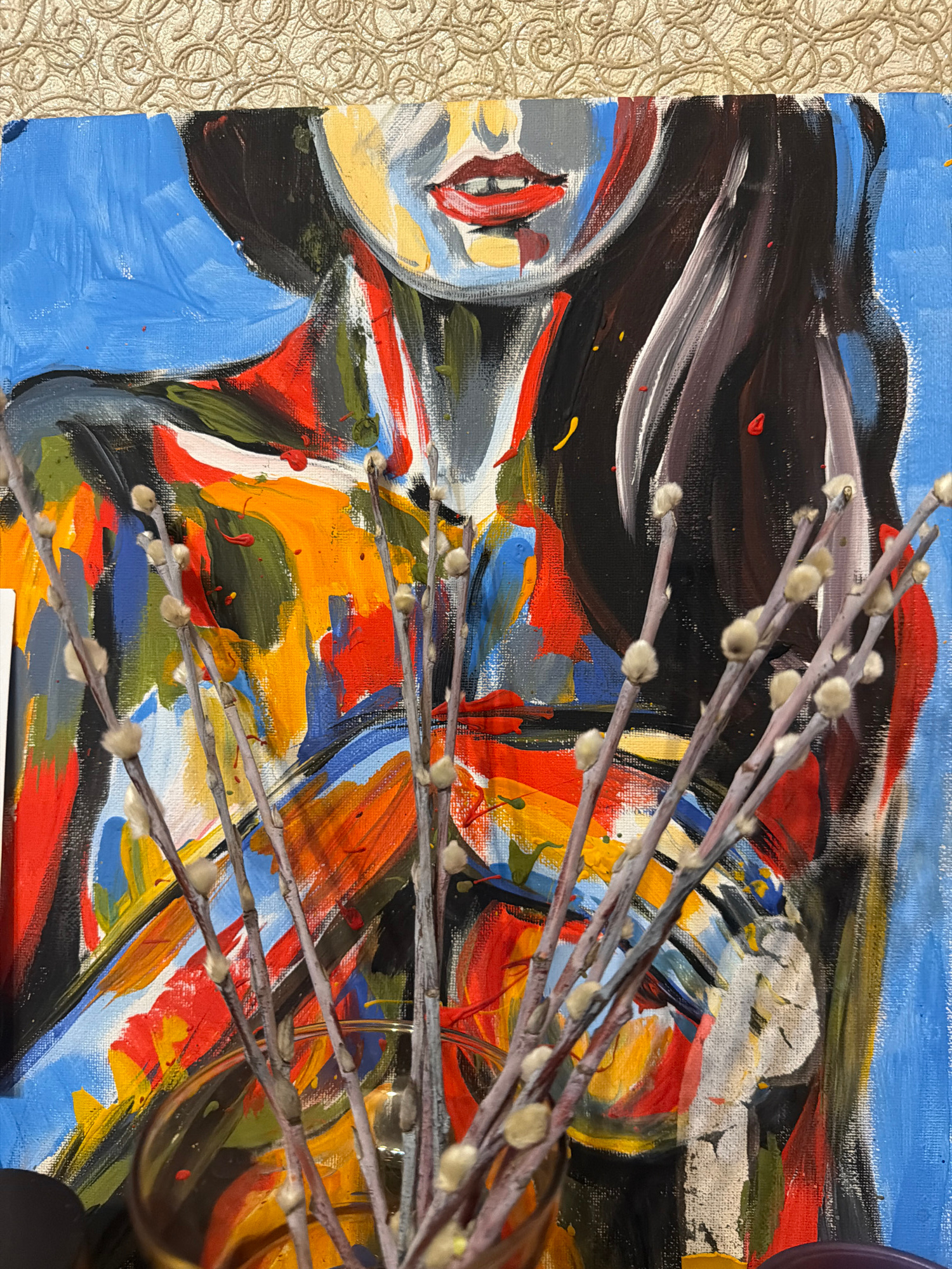 The image shows a close-up of an abstract painting with branches bearing furry buds placed in front of it. The painting features bold brushstrokes in a variety of colors, including blue, red, yellow,…read more