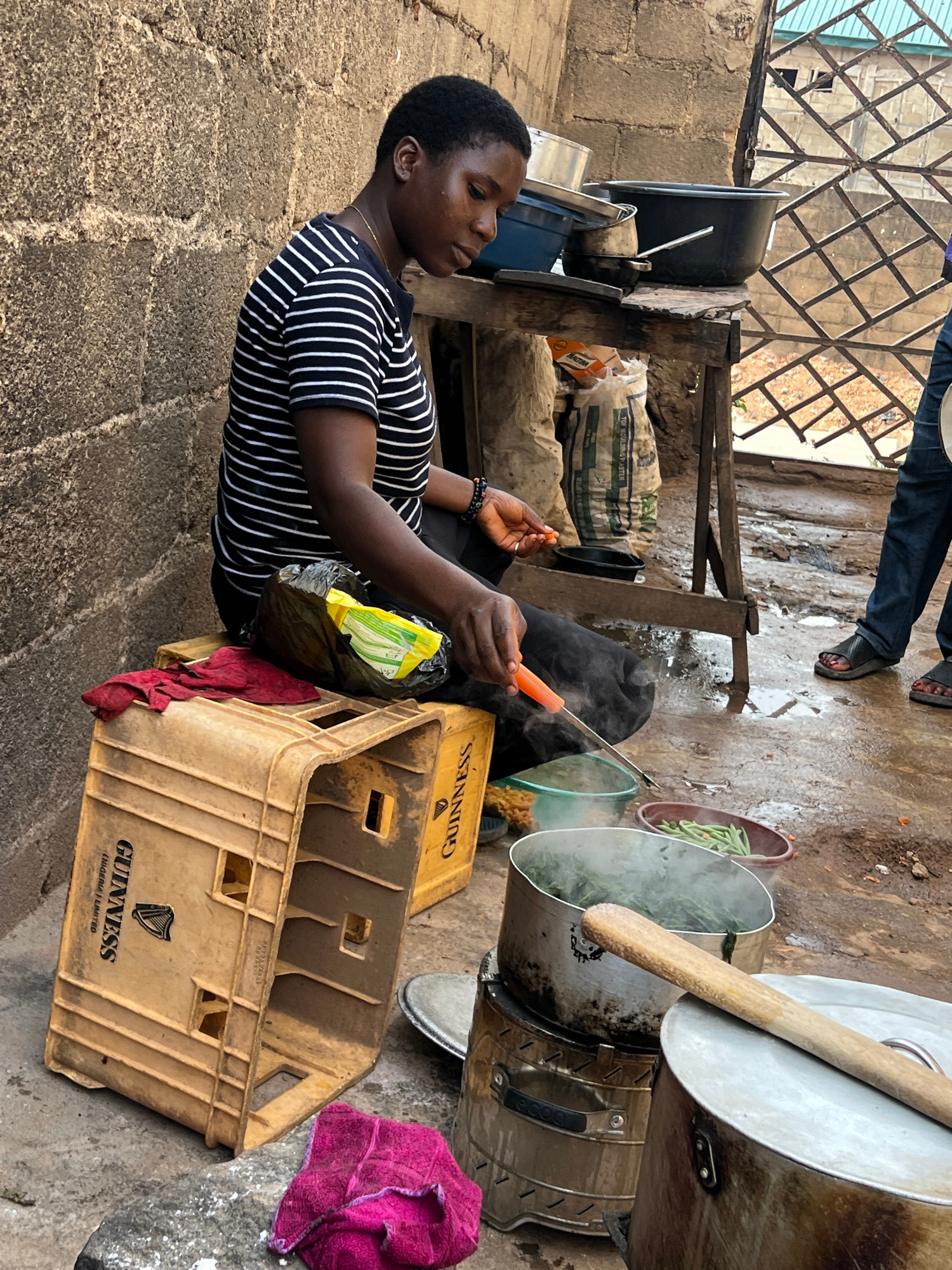 In Jos, Nigeria, a person is sitting outdoors next to a cooking setup. The individual is wearing a striped shirt and dark pants, holding an orange object, possibly a carrot, in their left hand and a kβ¦read more