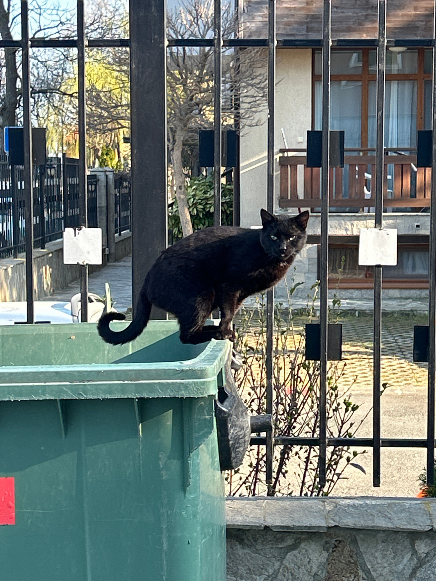 A black cat is perched on the edge of a green trash bin. The bin is near a black metal fence. Behind the fence, there is a building with windows and a stone wall. Bare branches of trees are visible in…read more