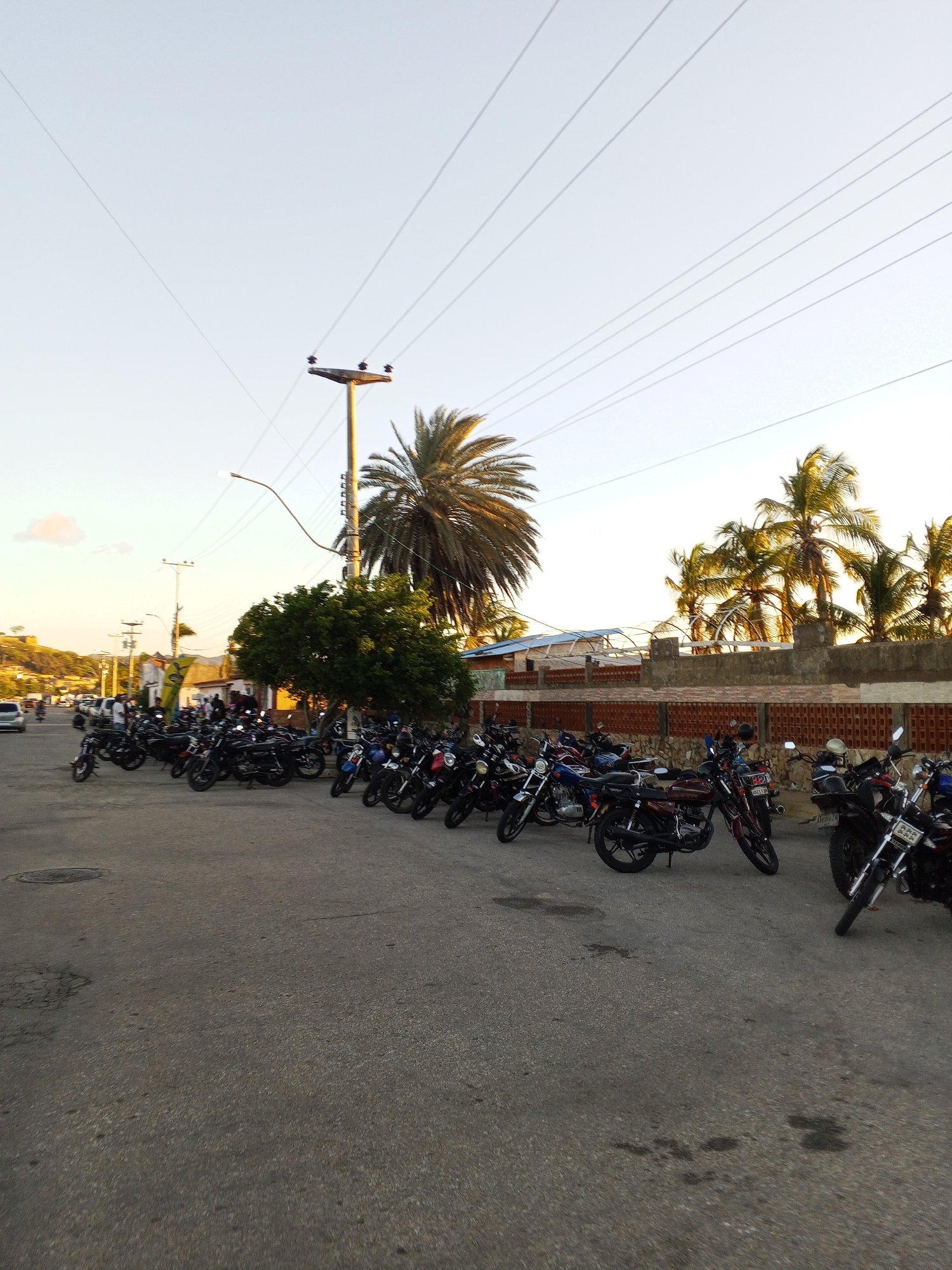The image depicts a street in Juan Griego, Venezuela. Numerous motorcycles are parked along the side of the road. A palm tree and other smaller trees are present. In the background, there is a buildinβ¦read more