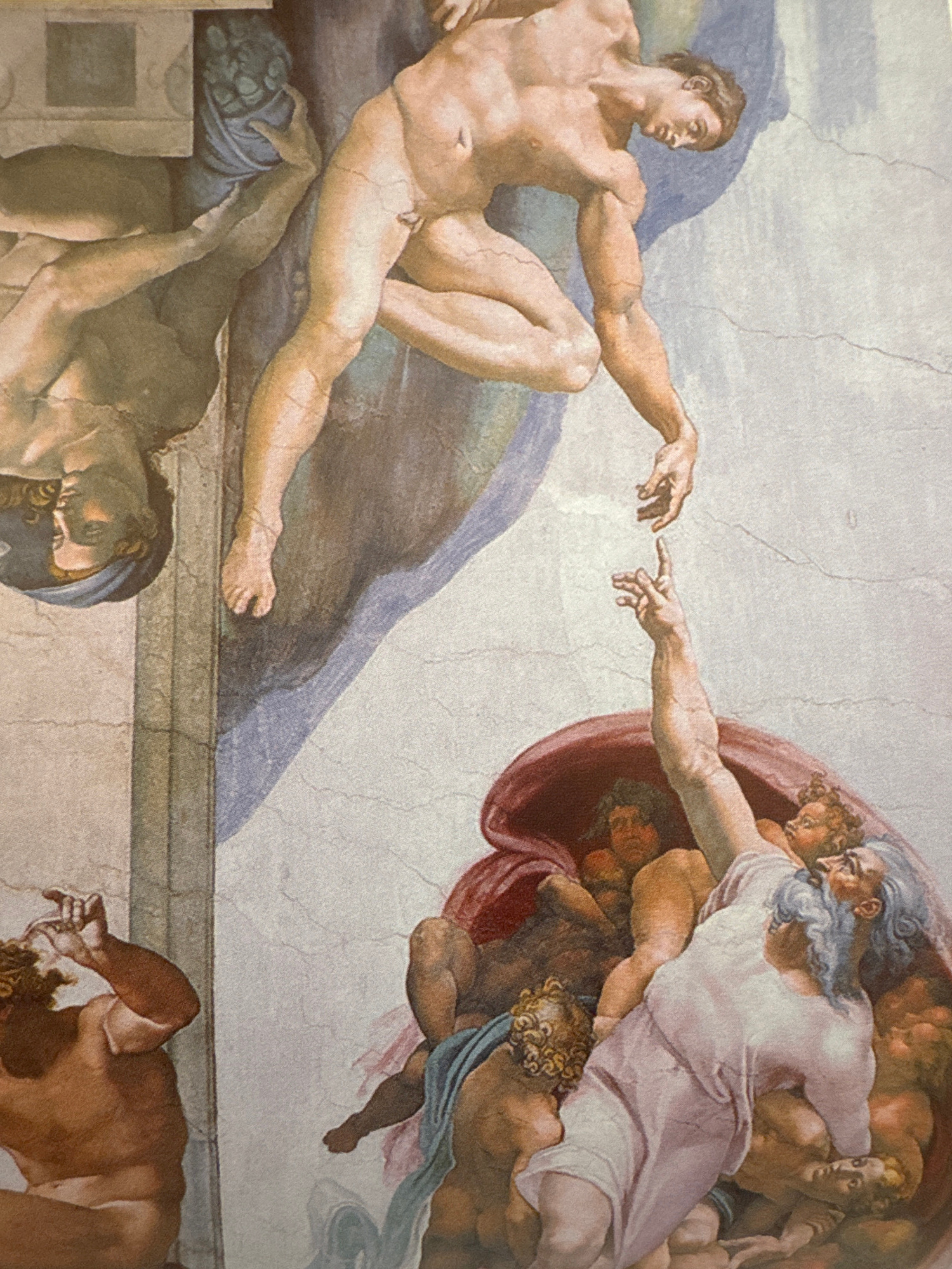 This is a depiction of Michelangelo's fresco "The Creation of Adam" from the Sistine Chapel ceiling. God, surrounded by figures, reaches out to touch the finger of Adam, who reclines naked on a green…read more