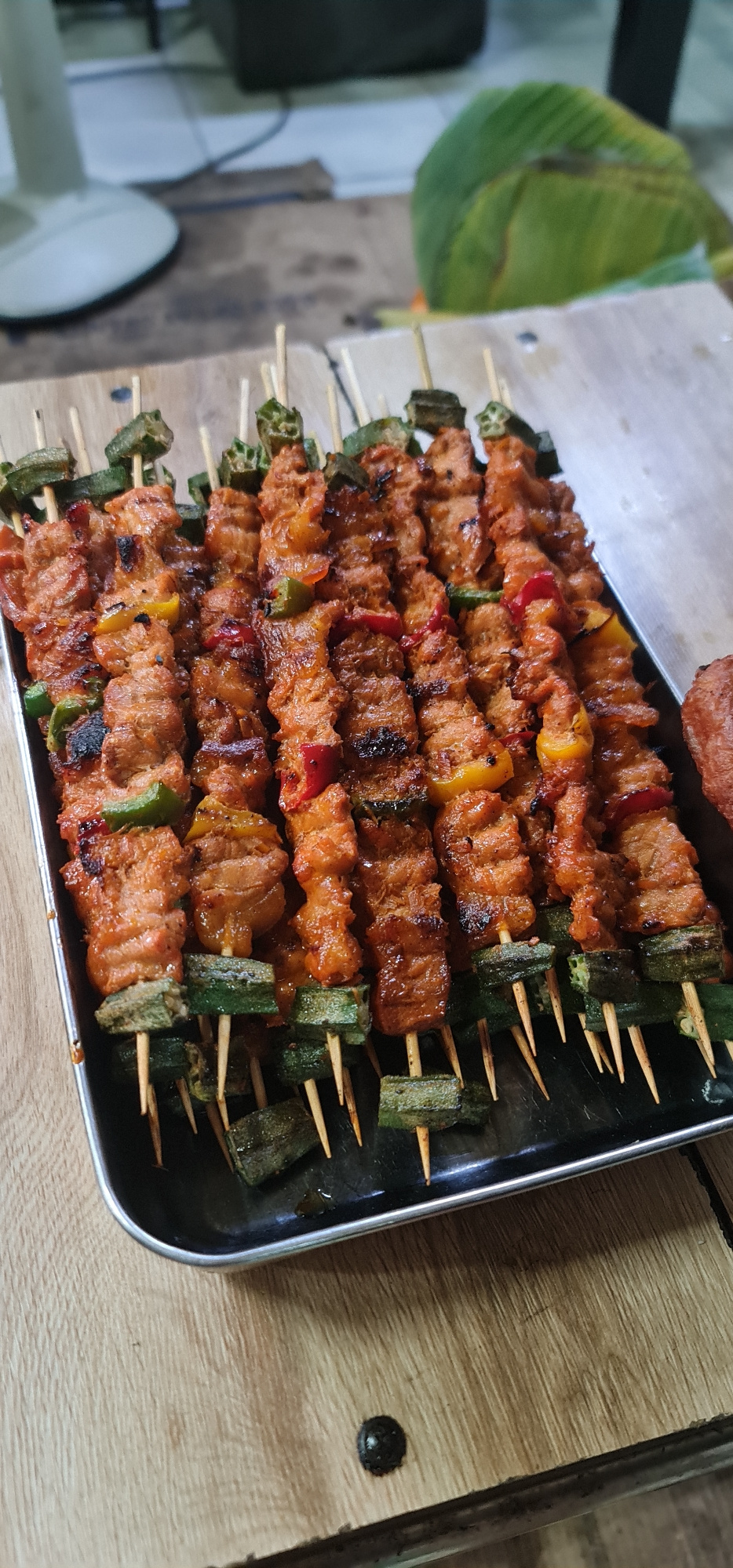 A slightly angled, close-up shot displays numerous grilled skewers neatly arranged on a dark, rectangular tray. Each skewer features alternating pieces of marinated meat, which are reddish-brown and s…read more
