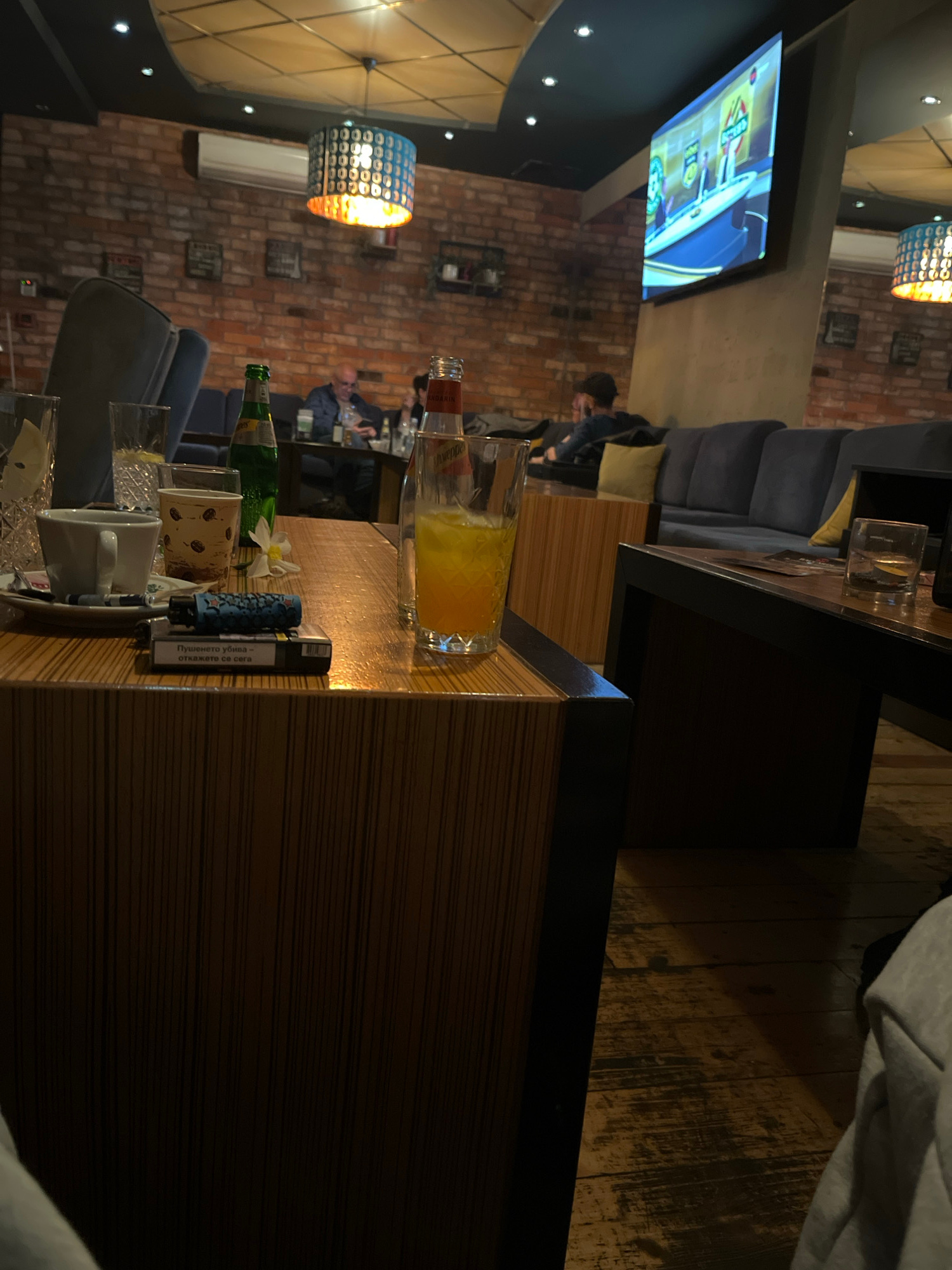 The image shows a dimly lit interior space, potentially a bar or restaurant, located in Karlovo, Bulgaria. The space features a brick wall with mounted decorations, overhead lighting fixtures, and a t…read more