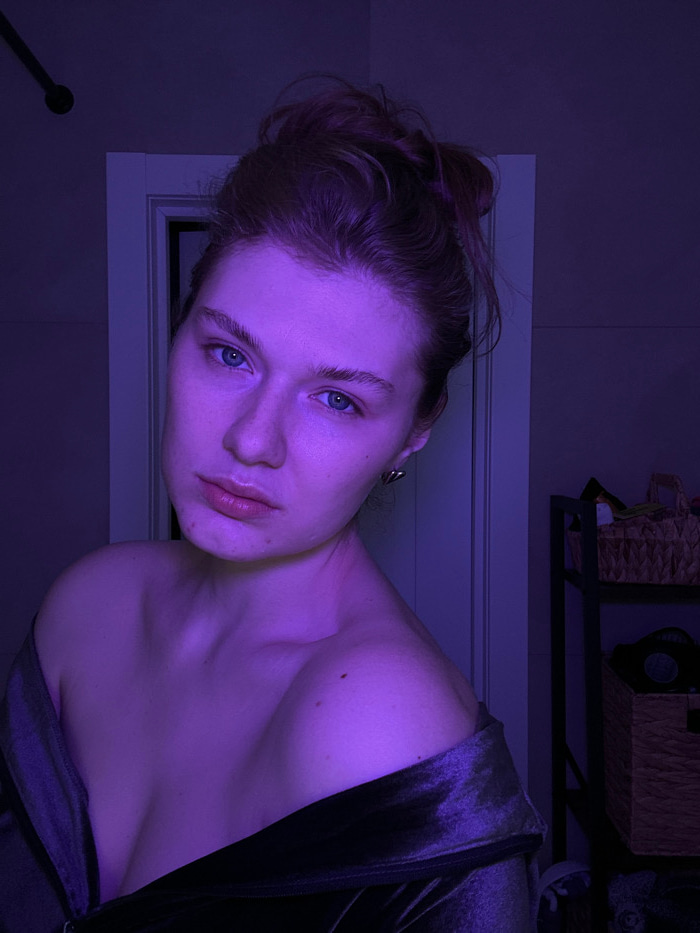 A woman with fair skin is angled to the left, gazing at the camera under violet lighting. Her auburn hair is gathered in a loose bun. She has blue eyes, full lips, and a mole on her chest. A velvet fa…read more