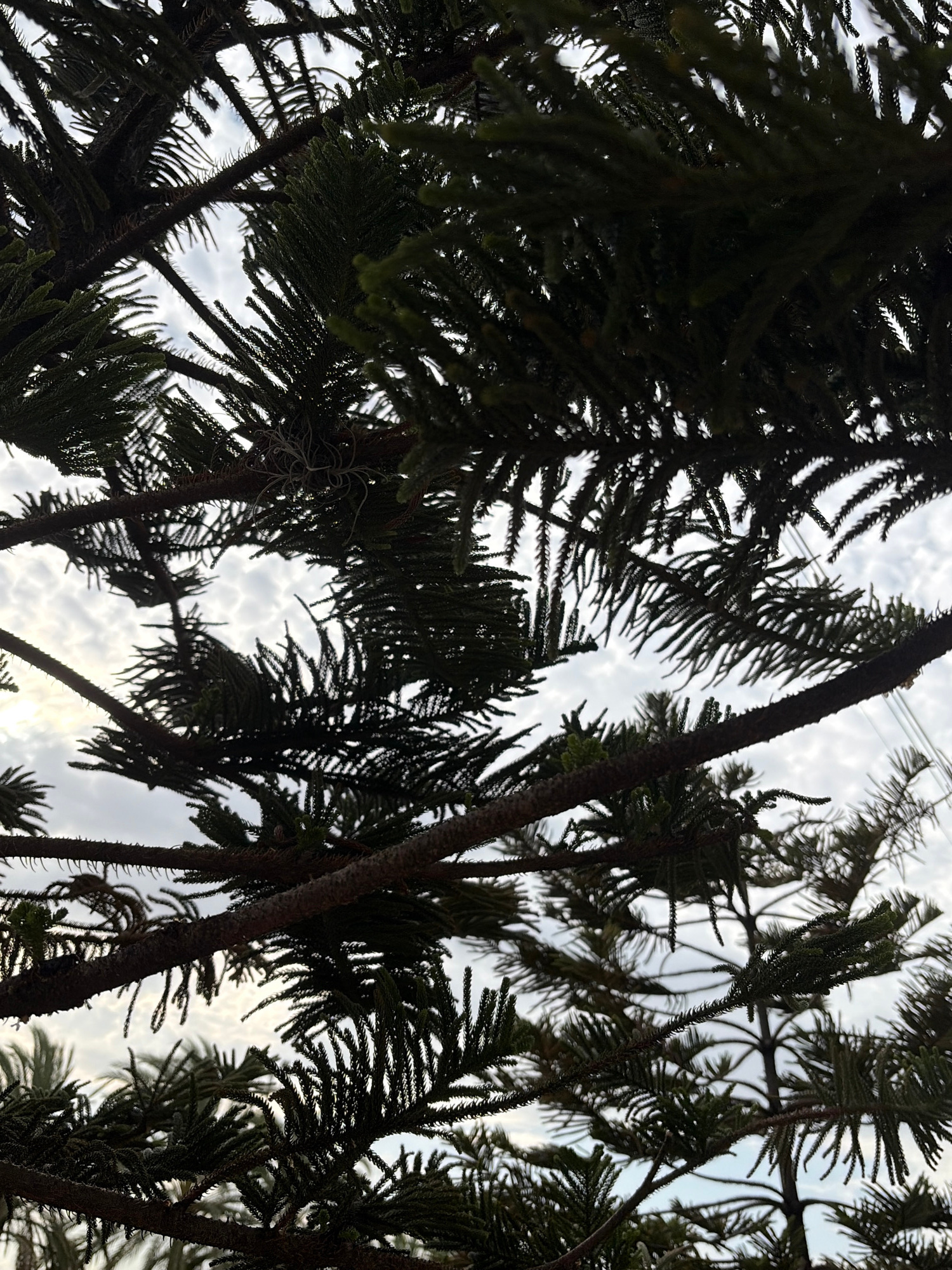 The image provides an upward view into the dense canopy of a coniferous tree, likely a species such as a Norfolk Island Pine, characterized by its layered branches and needle-like foliage. The dark si…read more
